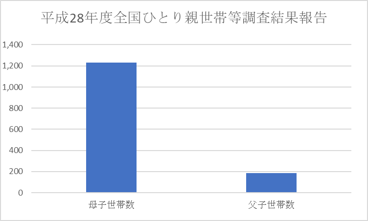 厚生労働省が平成28年に実施した全国ひとり親世帯等調査結果報告によると、母子世帯 1,231.6 千世帯、父子世帯 187.0 千世帯となっています。 圧倒的に女性の一人親世帯が多いことがわかります。