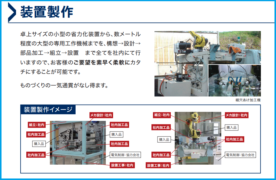 また、部品を製作するだけでなく、切削加工(せっさくかこう)業者では類を見ない技術部があり、設計者がおりますので、構想(イメージ)→図面設計→部品加工→組立→設置まで、全てを社内で完結できることが可能です。
