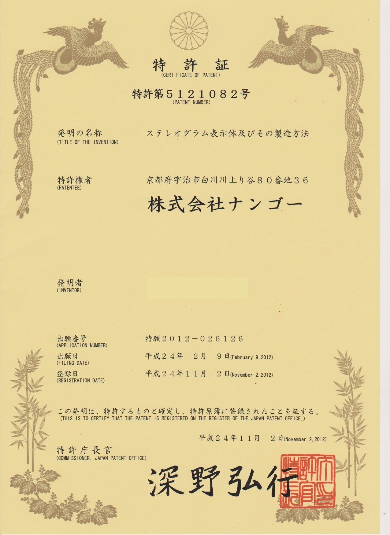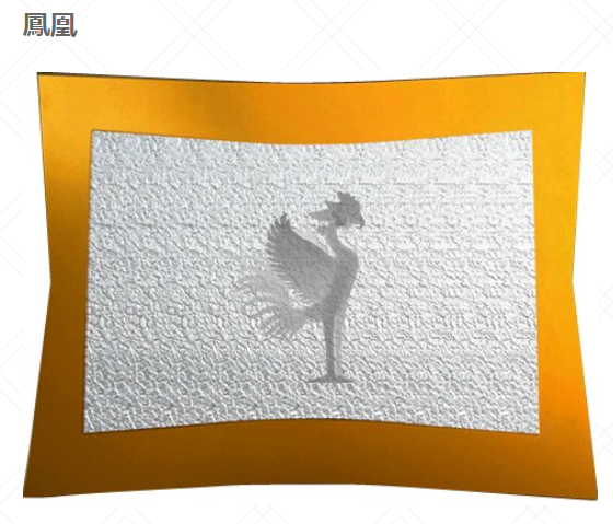 これまで印刷物等平面にのみ描写されていたこのトリックアートを、厚みのある金属に(株)ナンゴー独自の技術で凹凸をつけ立体造形物化し、ステレオグラムを再現しています。単なる紋様に見える中央の部分を目の焦点をずらして眺めると、文字や図柄が浮かび上がってきます。