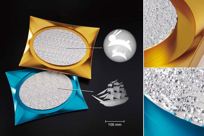 これまで印刷物等平面にのみ描写されていたこのトリックアートを、厚みのある金属に(株)ナンゴー独自の技術で凹凸をつけ立体造形物化し、ステレオグラムを再現しています。単なる紋様に見える中央の部分を目の焦点をずらして眺めると、文字や図柄が浮かび上がってきます。