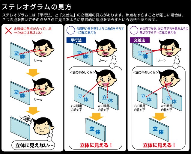 3dステレオグラムには「平行法」と「交差法」の2種類の見方があります。焦点をずらすことが難しい場合は、2つの点を書いてその点が3点に見えるように意図的に焦点をずらすという方法もあります。