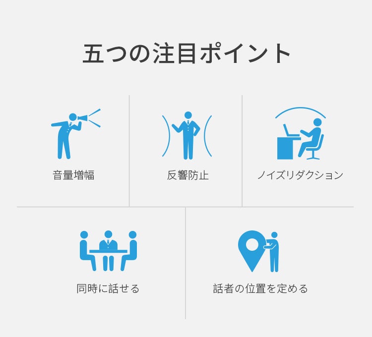 360°全方向集音、音量増幅、VoiceIAノイズリダクション、反響防止などの機能を搭載しております。