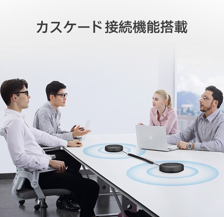 カスケード接続機能を搭載しているので、カスケードケーブルで2台のスピーカーフォン「eMeet Luna」を繋げれば集音範囲を拡大でき、大人数のミーティングも対応可能になります。