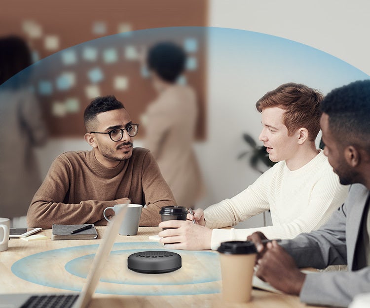 「eMeet Luna」は遠隔会議に特化したスピーカーフォンとして、3つのマイクを搭載することで集音性能を大幅アップしました。マイクの正面にいなくても声をしっかり拾い、クリアな通話を実現しました。テーブルなどの中央に置いて複数(5~8人)で使用できます。