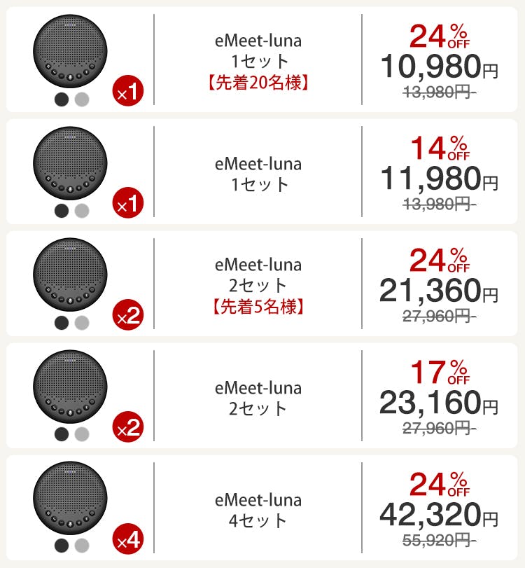しかし、テレビ会議でも「話し相手の声が小さくてよく聞こえない」、「エアコンの音、椅子の引きずる音などの雑音がうるさい。」といった問題が発生します。そんな問題に悩んでいるあなたにこちらの「eMeet Luna 」スピーカーフォンをおすすめします。