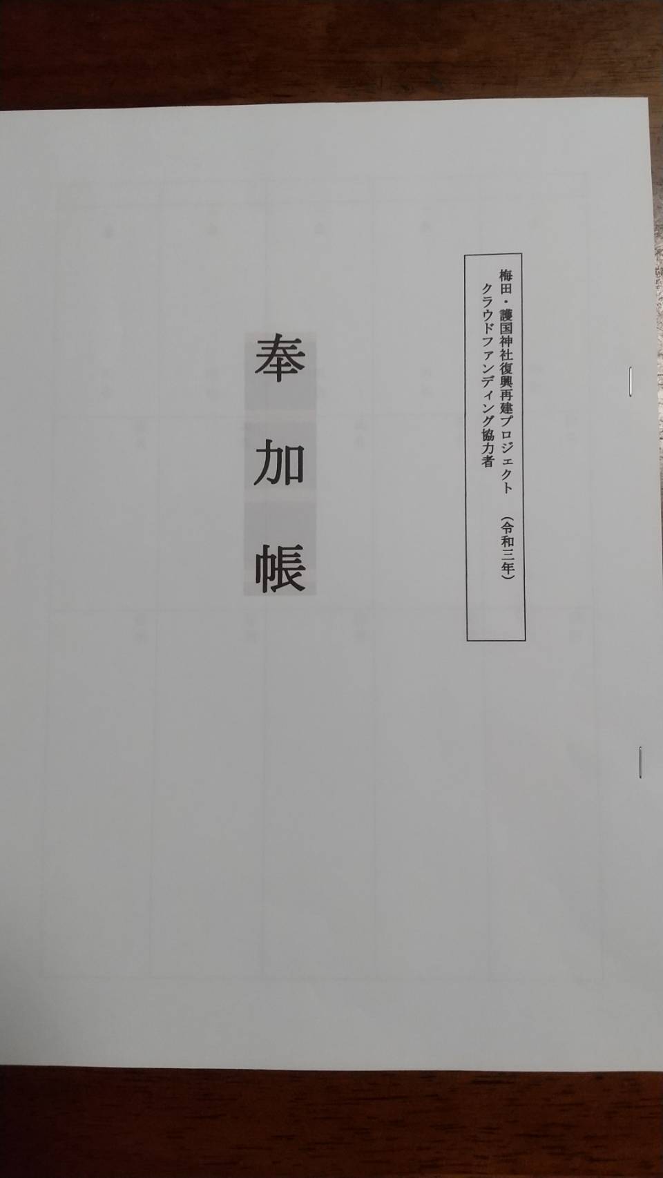 ⑤芳名帳への記入:支援金額・お名前・ご住所を台帳に記載し、社殿にて非公開の芳名帳として丁重に保存いたします。 ※備考欄にご氏名(フリガナ)・ご住所のご記入をお願いいたします。ご記入いただけない場合、記載ができない場合があります。