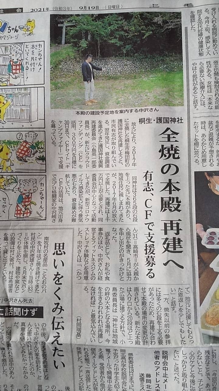 2021/09/20 00:10本日、上毛新聞に今回のプロジェクトを紹介してもらいました。上毛新聞の効果もあり、本日かなりの人数から支援を頂き、より一層今回のプロジェクトが盛り上がってまいりました。今回のプロジェクトを通して、皆様の繋がりと感謝を感じています。有難うございます。 もっと見る