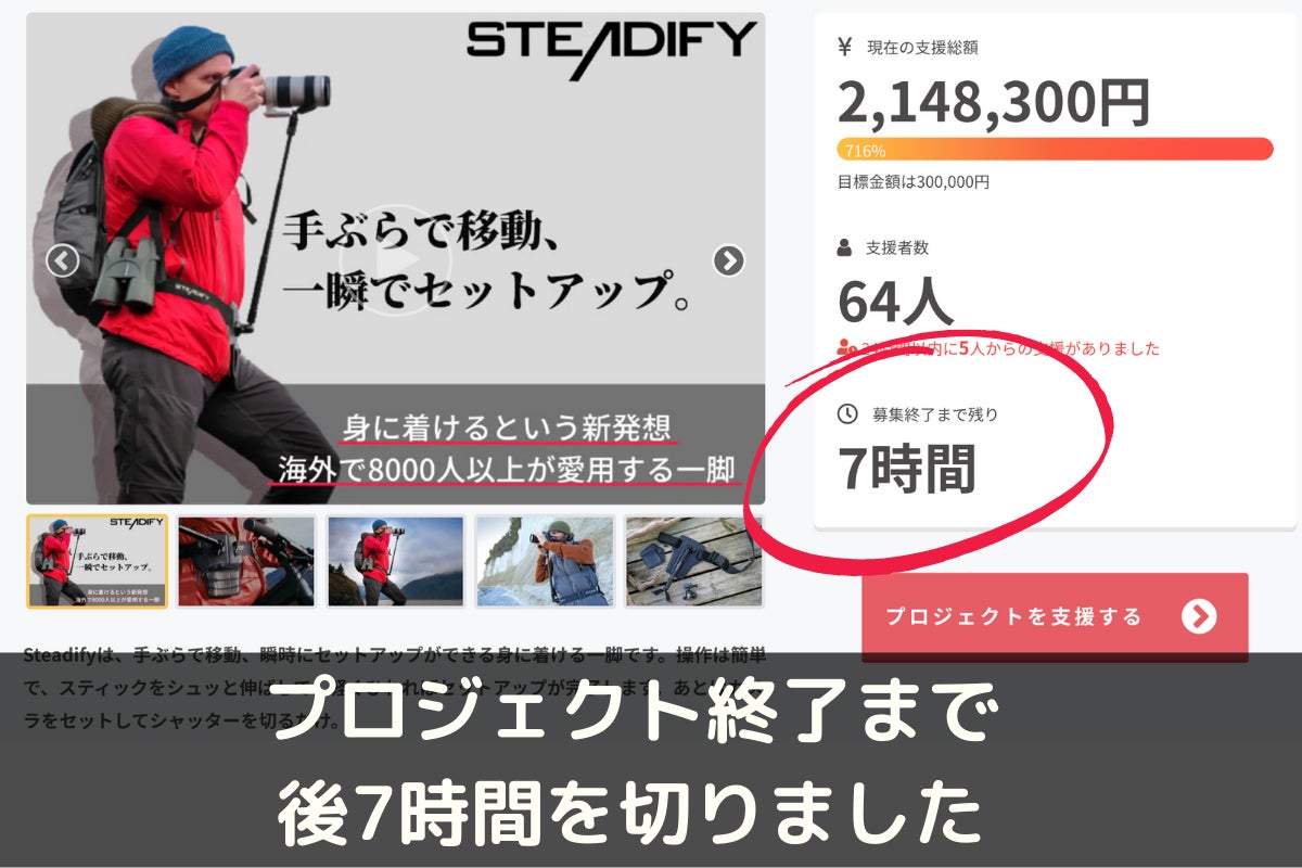 最後のお知らせです。後3時間でプロジェクトが終了します。→https://camp-fire.jp/projects/view/473194手ぶらで移動ができて、撮りたい時に一瞬でセットアップができる一脚「Steadify」一脚や三脚を持ち歩く必要もないので移動がとにかく楽ですし、ハンディで撮影するよりも手ブレが抑えられるので綺麗な写真が撮りやすくなり、撮影が今よりもっと楽しくなります!そんなSteadifyのプロジェクトも残すところ3時間で終了です。→https://camp-fire.jp/projects/view/473194そして今後の販売は未定です。欲しいけど悩んでいる方もいらっしゃると思いますが、本当に手に入れれるチャンスは残り3時間ですのでまずは購入してみてください。世界で8000人以上に愛用されており、サポート体制は万全ですし、保証もついております。買って後悔するようなことはさせませんので安心してお求めくださいませ。これまでプロジェクトにお付き合いいただき誠にありがとうございました。■Steadifyを手に入れるチャンスは残り3時間で終了■→https://camp-fire.jp/projects/view/473194