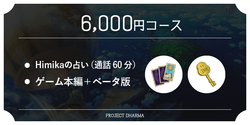 本作中で時折宿にお客として現れては、予言じみたことを言ったり、主人公の心中を見透かすようなことを言ったりする個性的なキャラクターである「占い師ヒミカ」のモデルである、Himikaさんに実際に占ってもらえるコースです。支援時に記入していただく情報をもとに鑑定を行います。占いはオンライン通話で行う予定です。