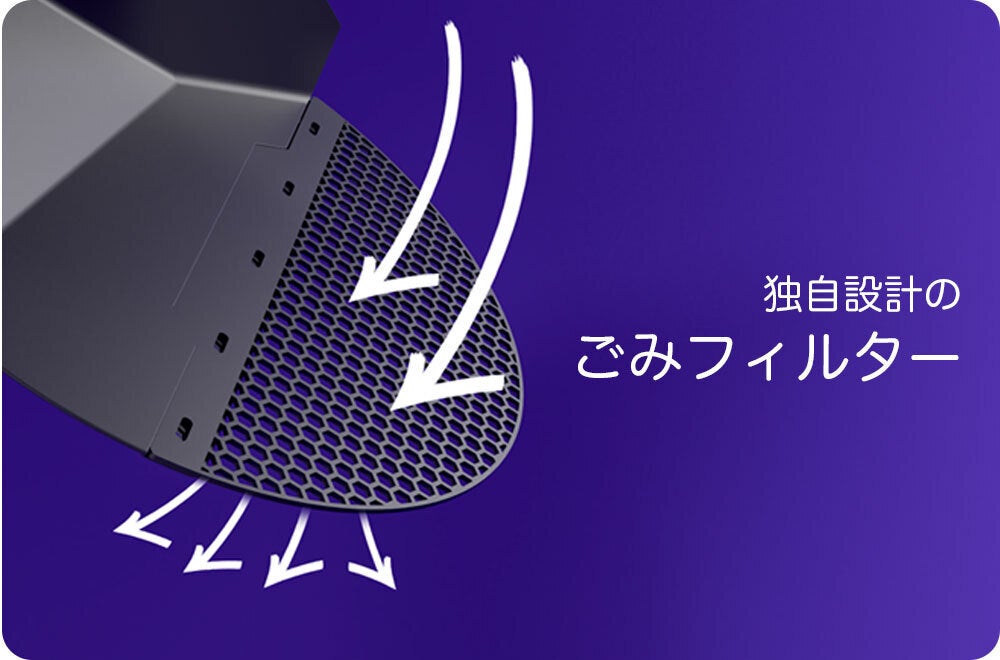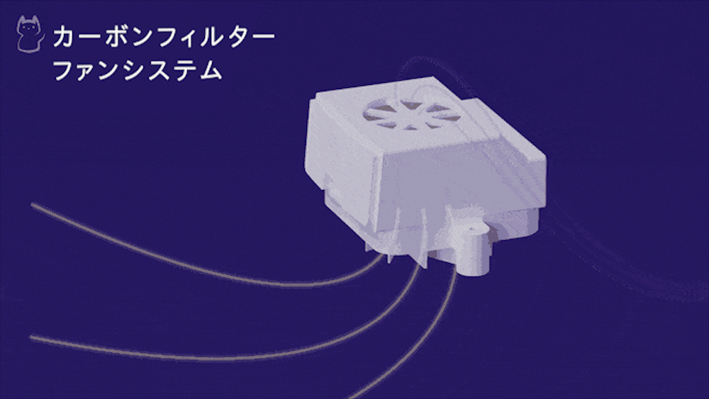 Aimicat専用に開発されたカーボンフィルターで、臭いの脱臭と内部の空気の濾過を行います。内部の一体型ファンでフィルター方面に空気の流れを作り、それで空気を濾過し外部に押し出します。濾過後は清潔で臭いがないため、排泄物の臭いが外部に漏れることはありません。