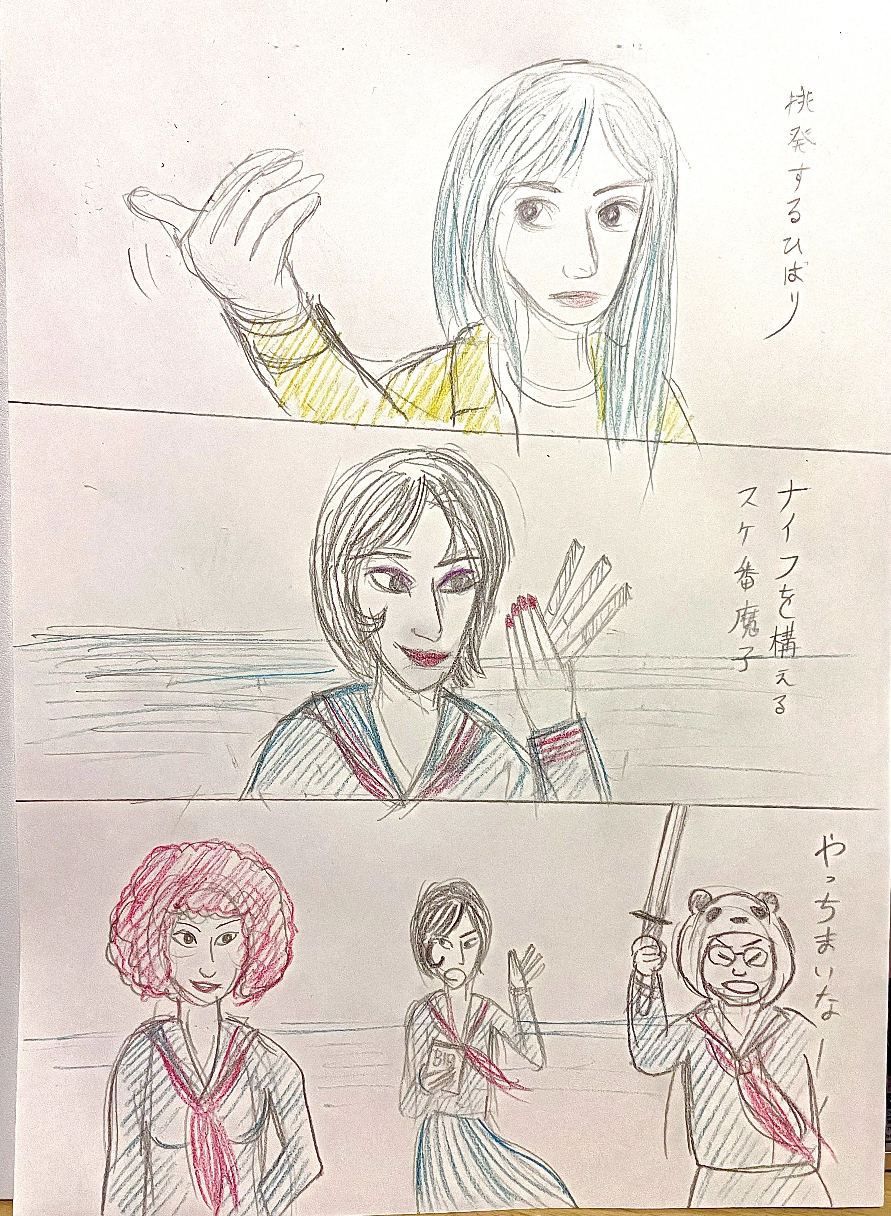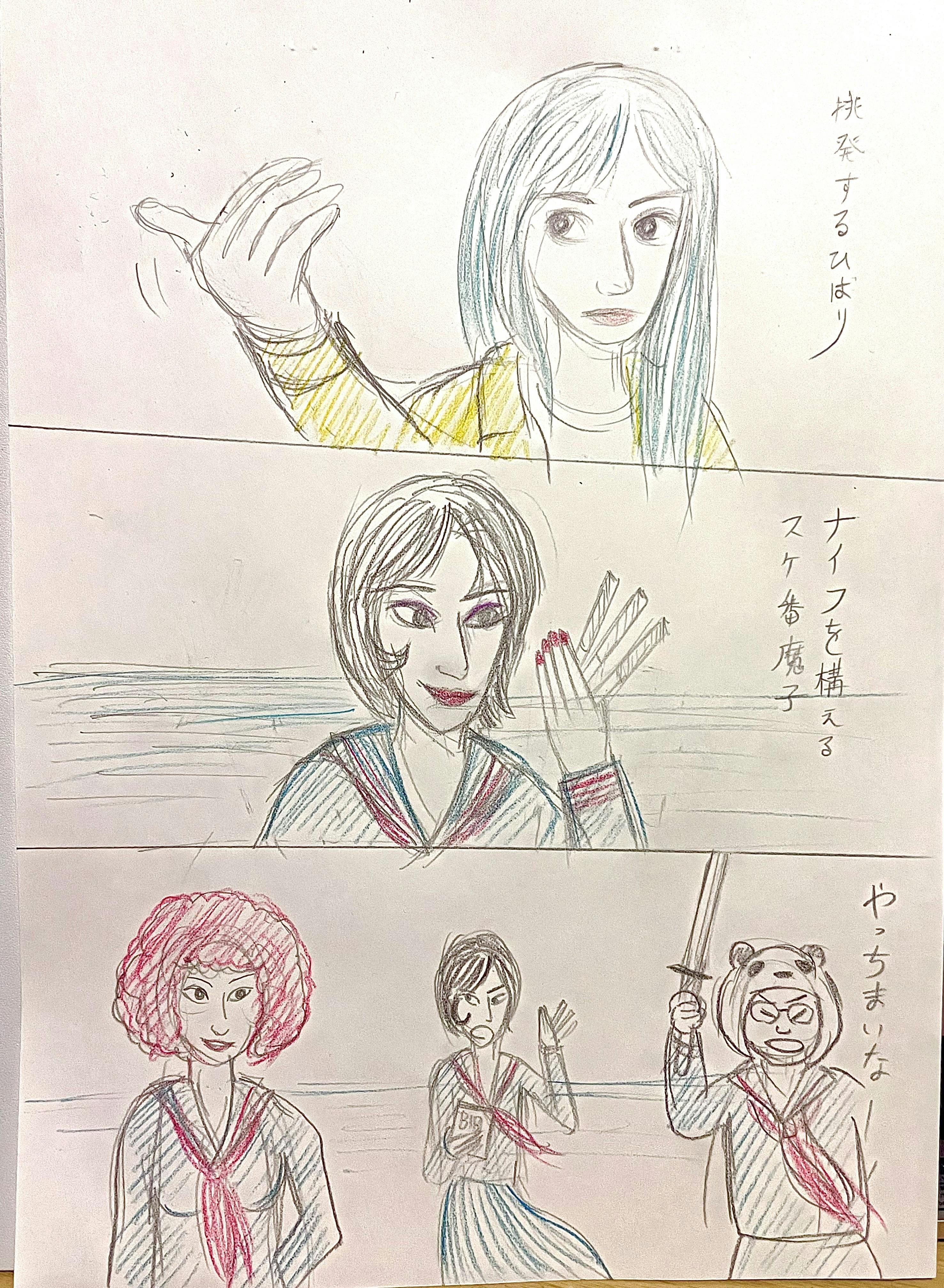 魔女のマイノリティのワンシーンの絵コンテです。絶対に面白くしますので、クラウドファンディングご支援をお願い致します。死亡遊戯と愛と誠とキルビル入ってます!