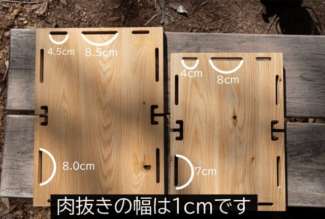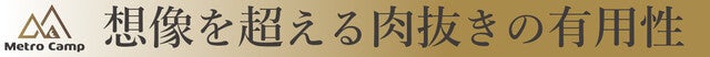 天板に肉抜きがあるのでキャンプの時にかなり役立ちます。肉抜きの幅は約1センチでシェラカップ、ナイフ等の様々なキャンプ用品をかけることができたり、ビニール袋をかけてゴミ袋にしたりと様々な用途で使うことができます。この肉抜きの可能性は無限大です!どう使うかはあなた次第!