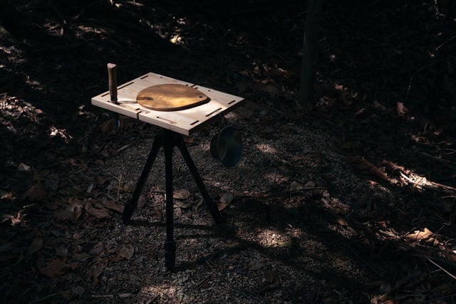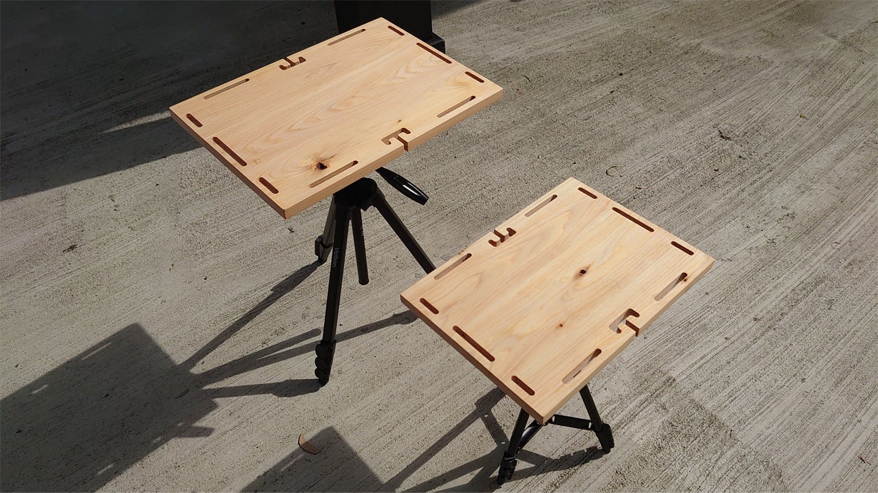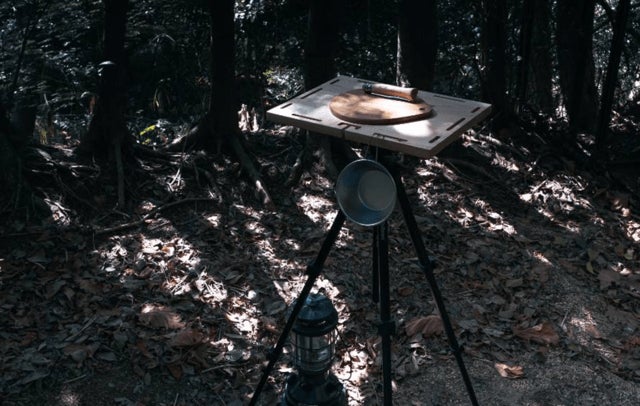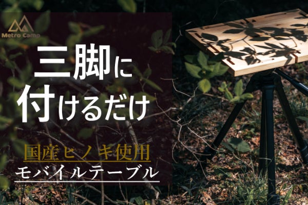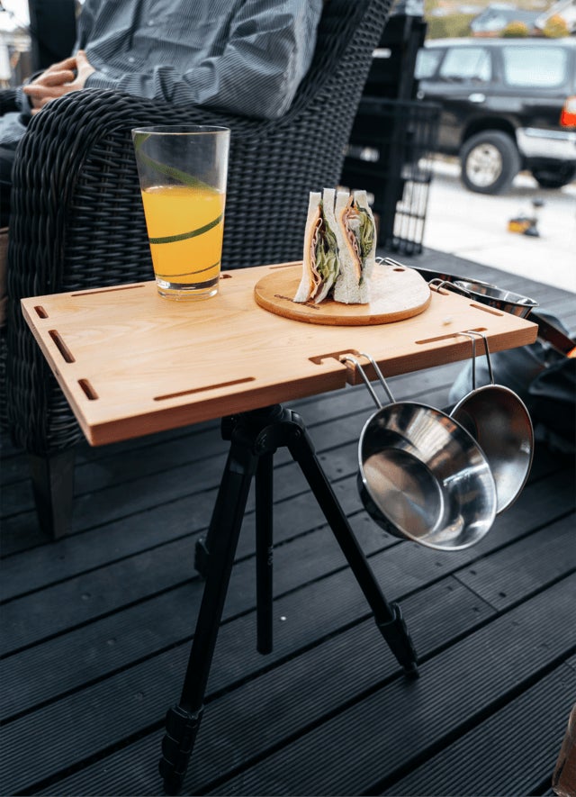 こちらの商品はフォトグラファー、YouTuber、キャンパーなどすべてのカメラ三脚を使う人向けに開発された商品です。撮影に使う三脚がこの天板をつけるだけでサイドテーブルへと早変わりします。なのでこの商品に三脚は付属しません。お持ちの三脚にこの商品をつけて楽しんでいただきたいです。