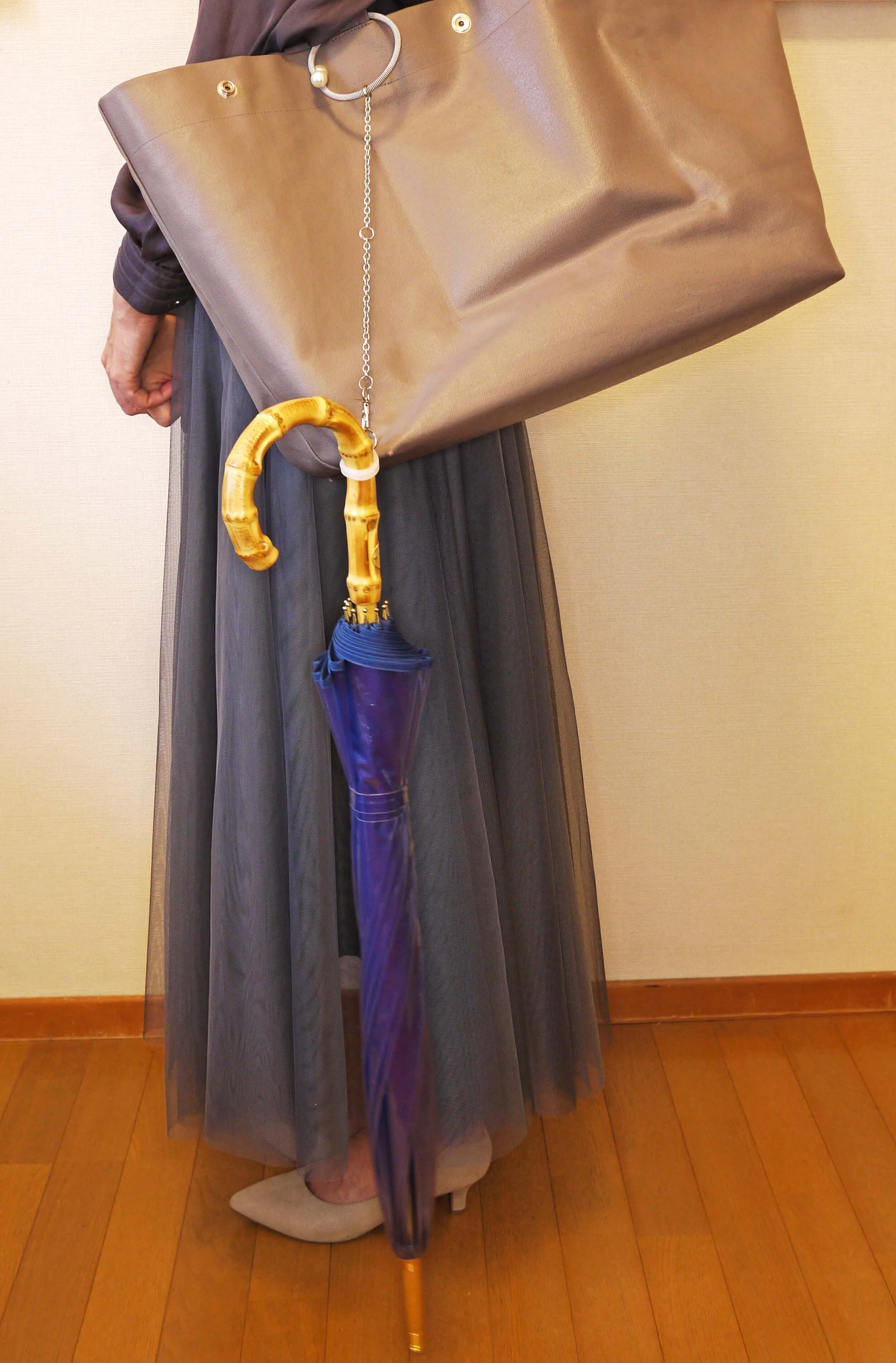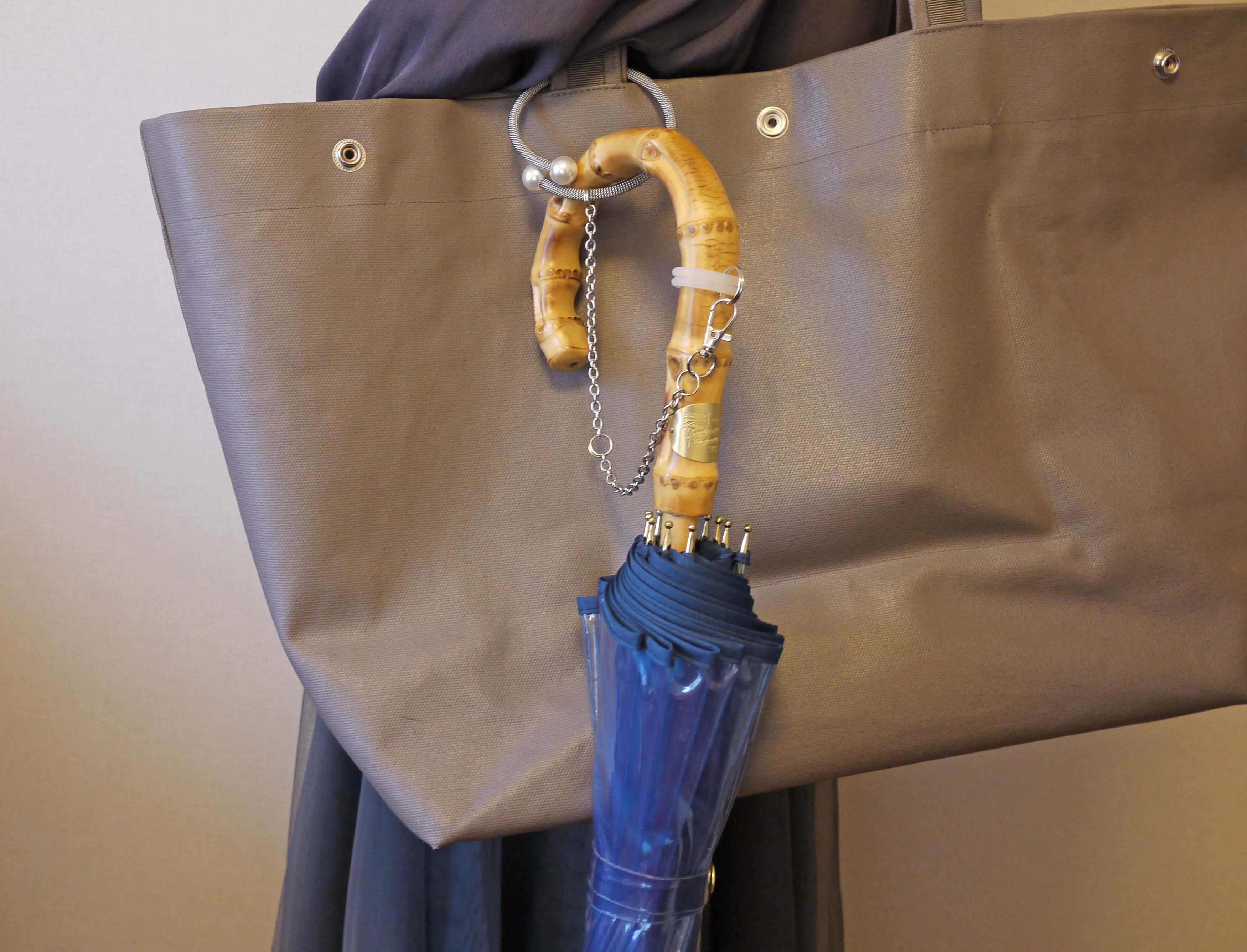 電車に乗ったら、アームをカバンの持ち手に付ければ傘を持たずに済みます。
