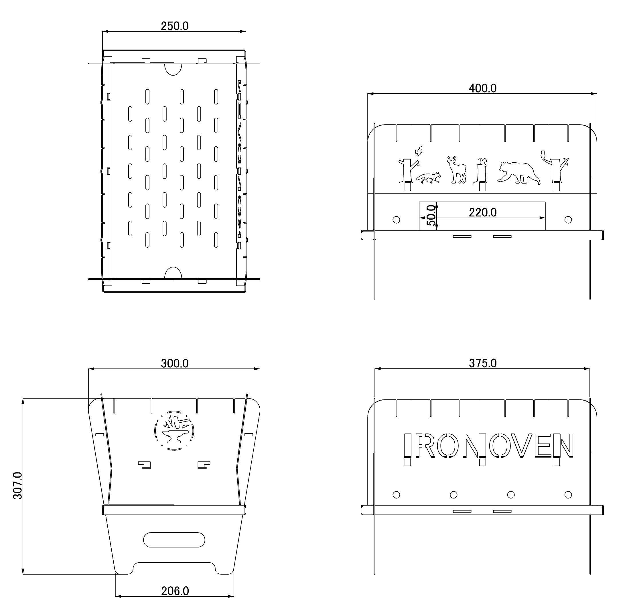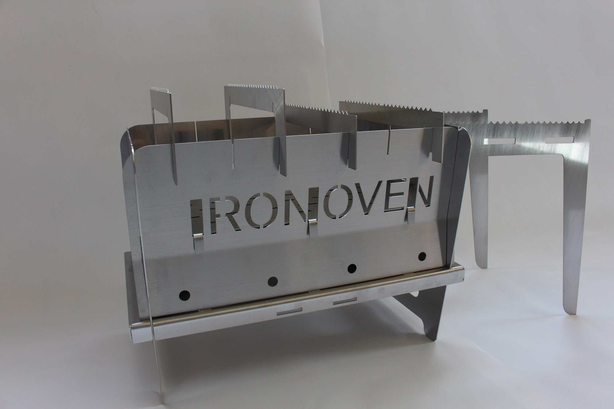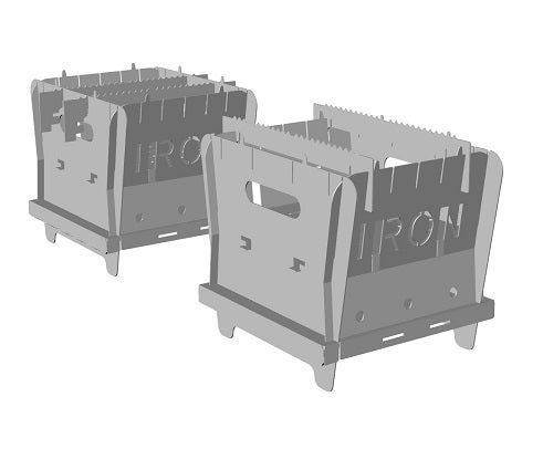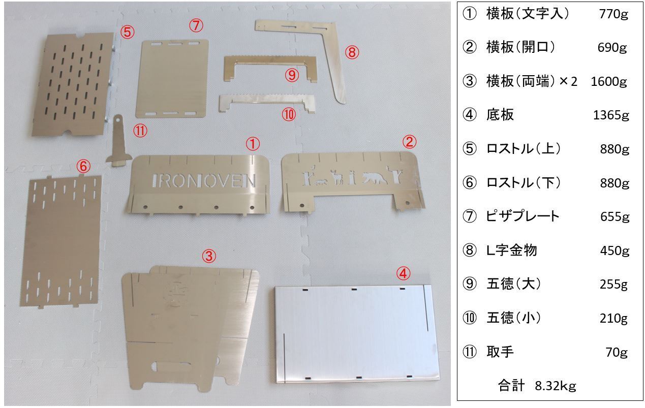アイアンオーブンはスタンダードサイズ・ミニサイズの2種類の規格がありどちらもすべてのパーツは錆や耐熱性に強いステンレス鋼板の板状の部品から構成されています。組み立ては鋼板をかみ合わせながら組み立てるだけでボルト止めや煩雑な作業は一切不要です。