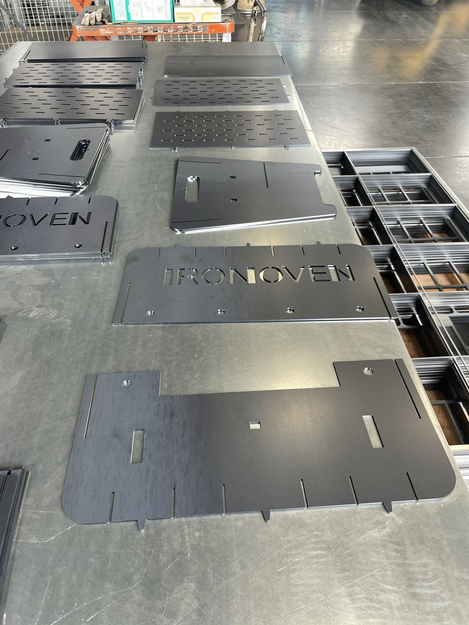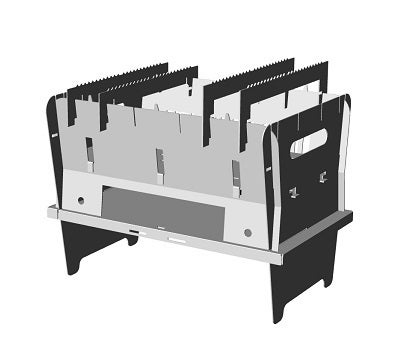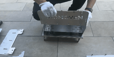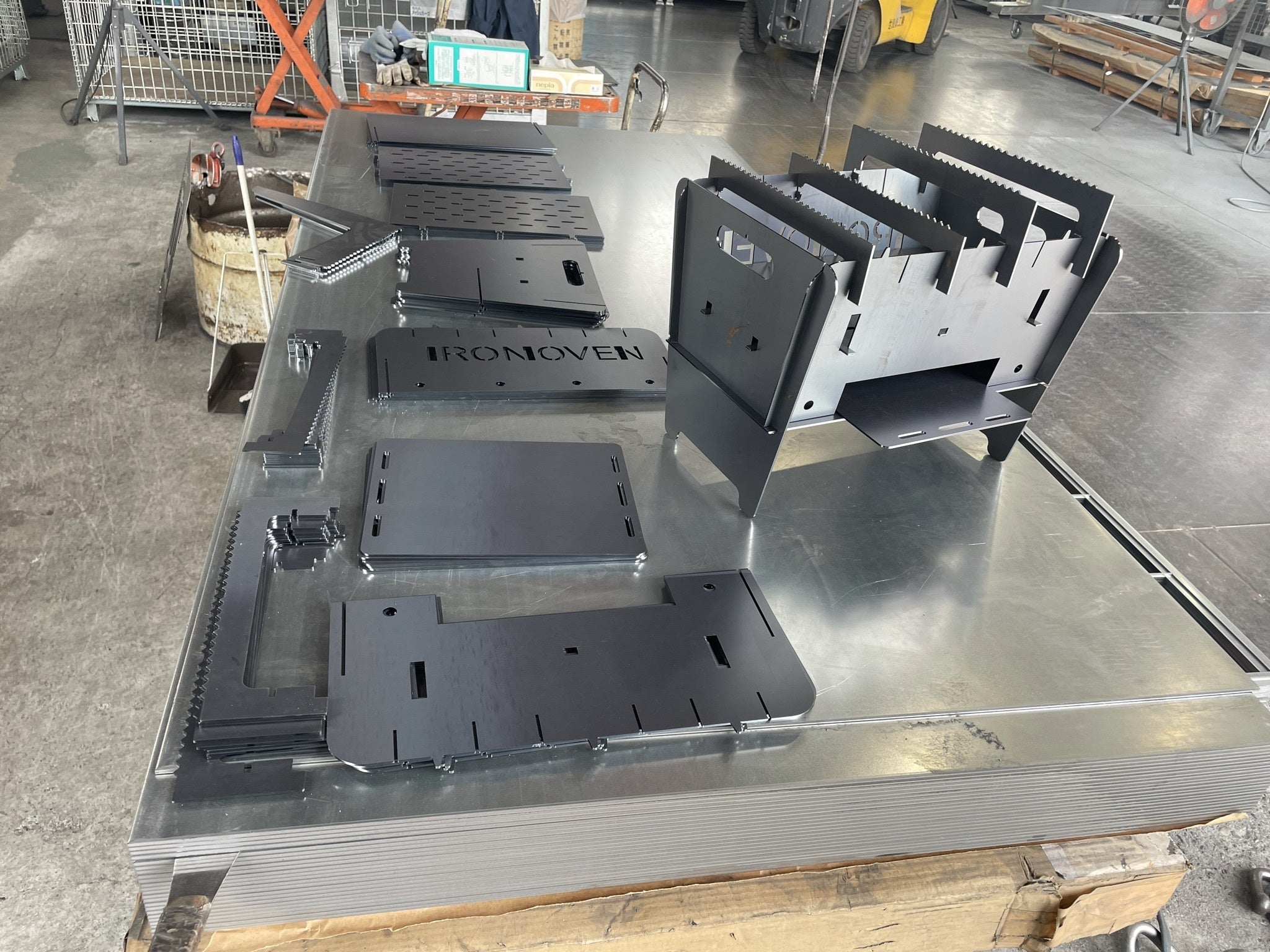 アイアンオーブンはスタンダードサイズ・ミニサイズの2種類の規格がありどちらもすべてのパーツは錆や耐熱性に強いステンレス鋼板の板状の部品から構成されています。組み立ては鋼板をかみ合わせながら組み立てるだけでボルト止めや煩雑な作業は一切不要です。