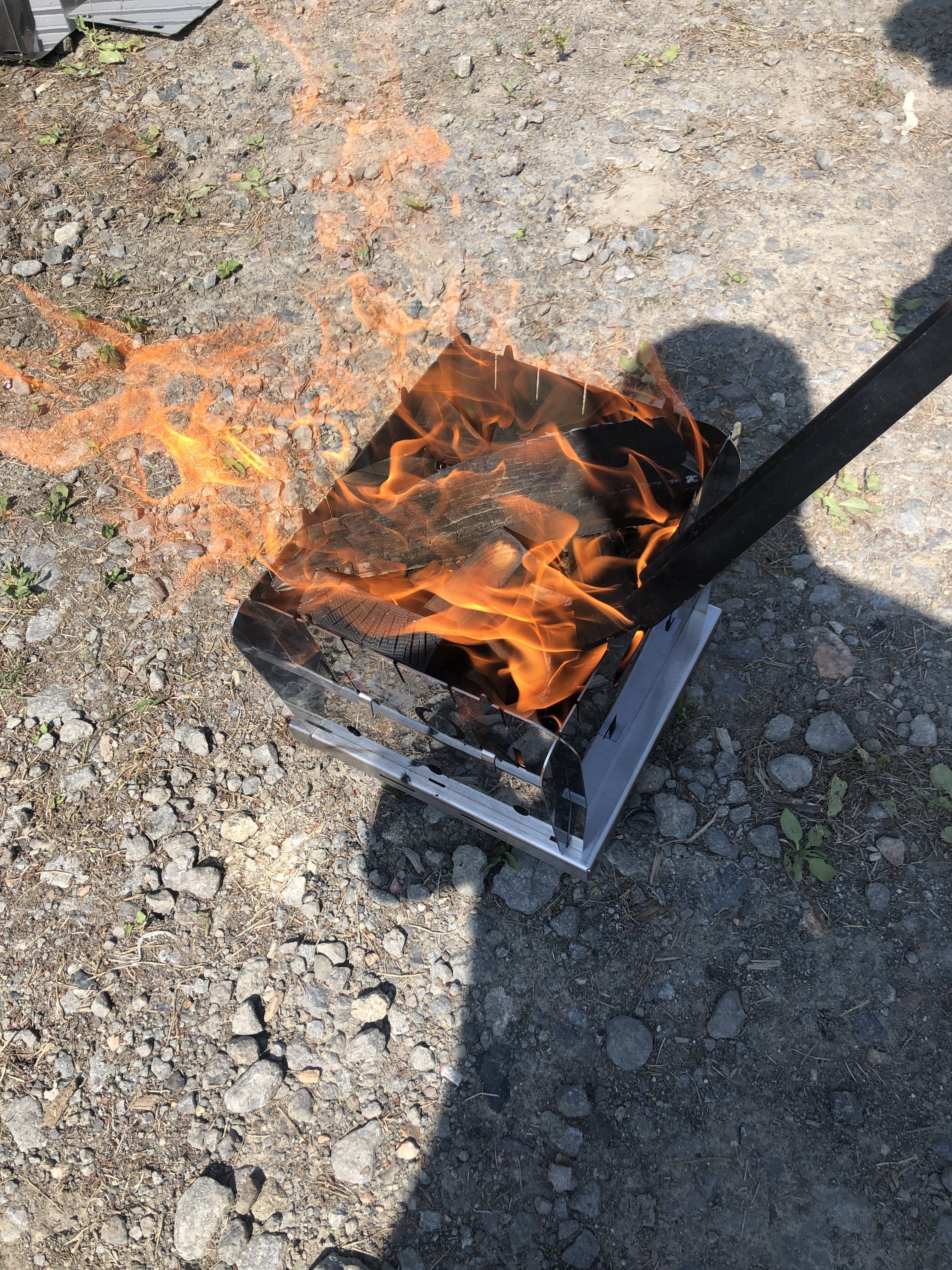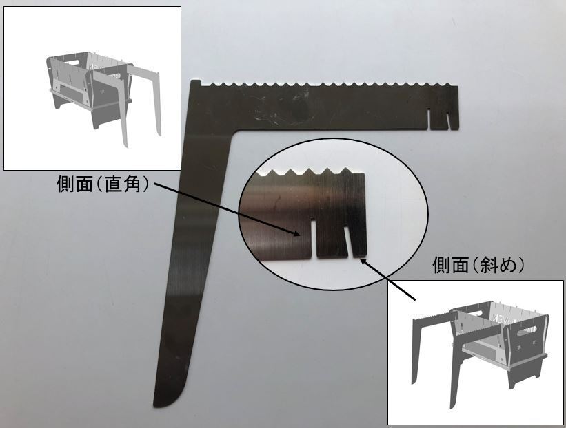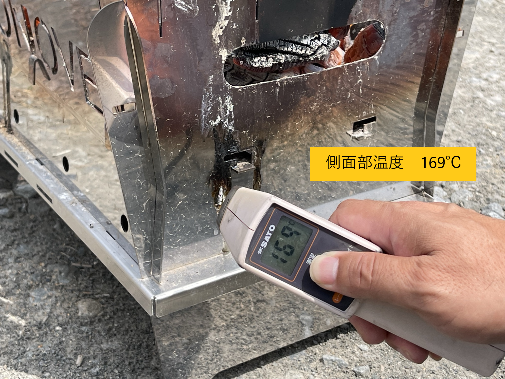 しかしここでまた問題が起きました。軽量化するために厚さを2.3㎜→1.5㎜としたこと、熱の滞留しやすいSUS304の特性により加熱時に製品に非常に大きなゆがみが発生しました。この改良のためモニターとして使用していた同じ当麻町にある木材卸業・加工業である「北央銘木×HOKUON」様から意見を頂きひずみ部に曲げ加工・金物の抑えとしてロック機能を付けるというアドバイスを頂き、北央銘木様にて様々な樹種での燃焼実験を行いました。