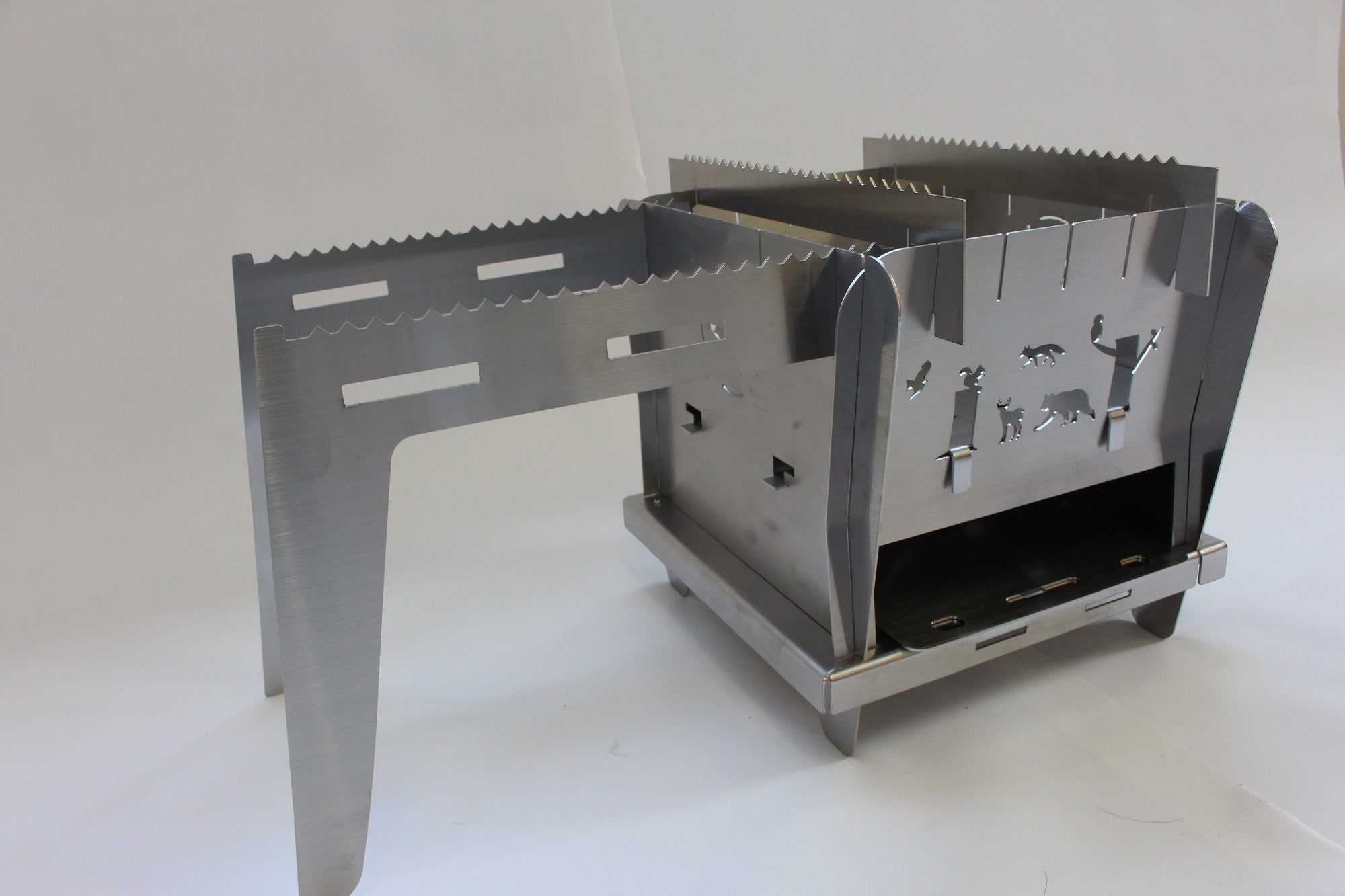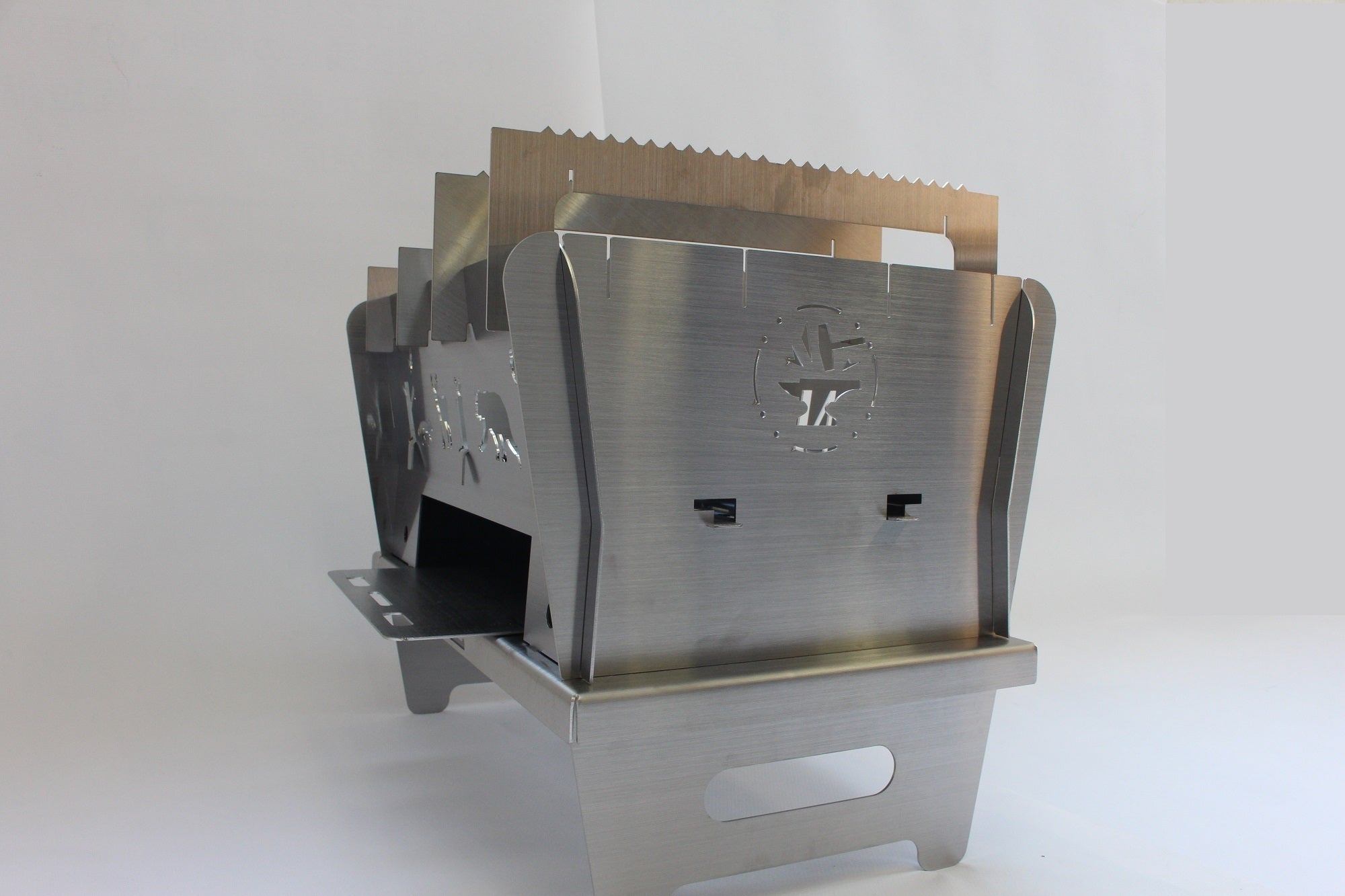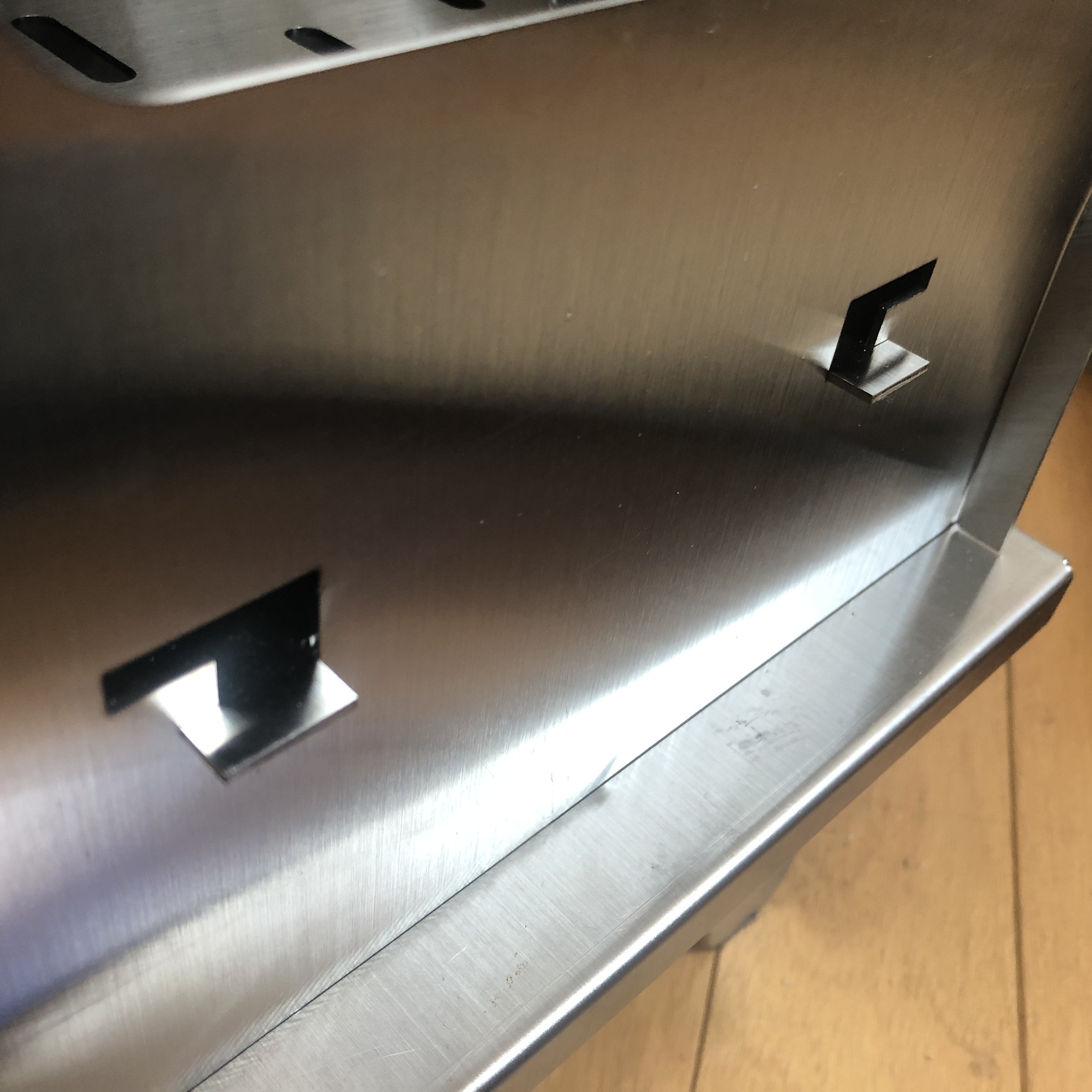しかしここでまた問題が起きました。軽量化するために厚さを2.3㎜→1.5㎜としたこと、熱の滞留しやすいSUS304の特性により加熱時に製品に非常に大きなゆがみが発生しました。この改良のためモニターとして使用していた同じ当麻町にある木材卸業・加工業である「北央銘木×HOKUON」様から意見を頂きひずみ部に曲げ加工・金物の抑えとしてロック機能を付けるというアドバイスを頂き、北央銘木様にて様々な樹種での燃焼実験を行いました。