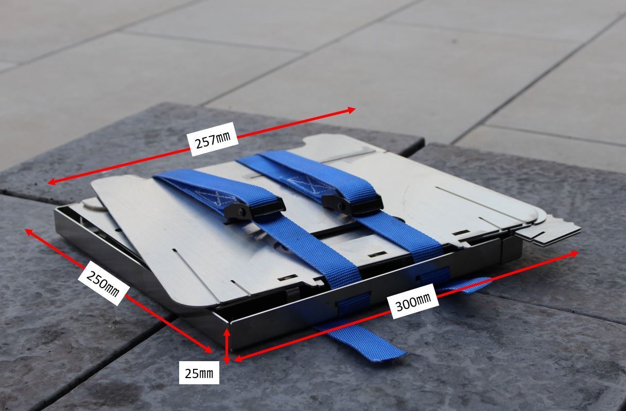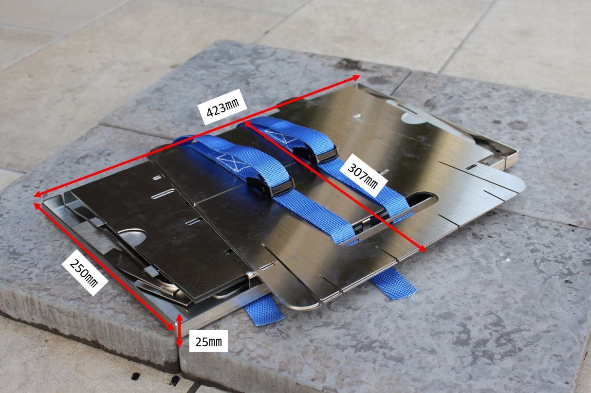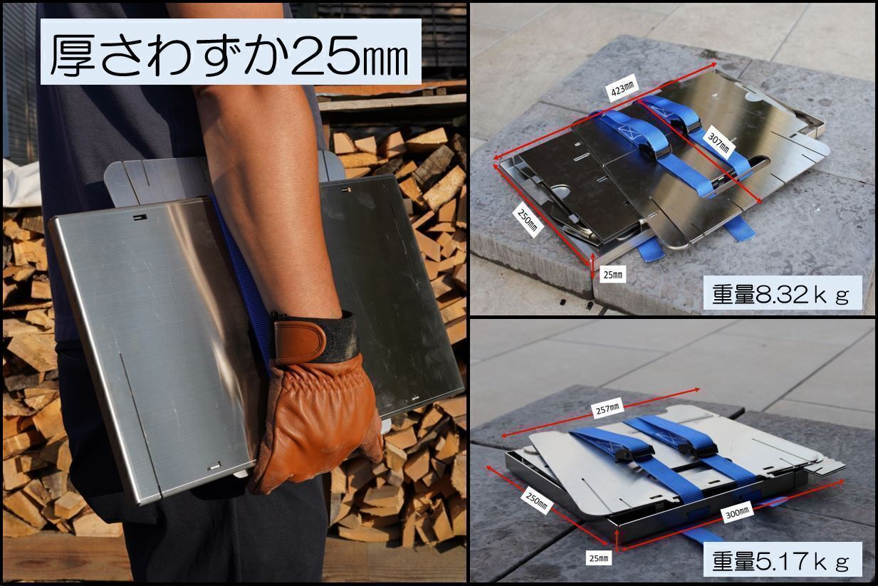 収納時は箱状の底板へすべての部品を収納し、横板(両端)で蓋をして付属ベルトで底板の穴を通して縛ることによりスタンダードタイプで423㎜×307㎜×25㎜、ミニタイプで300㎜×250㎜×25㎜と通常の焚火台と比べ非常にコンパクトに収納できるため場所をとらずに収納・持ち運び可能です。