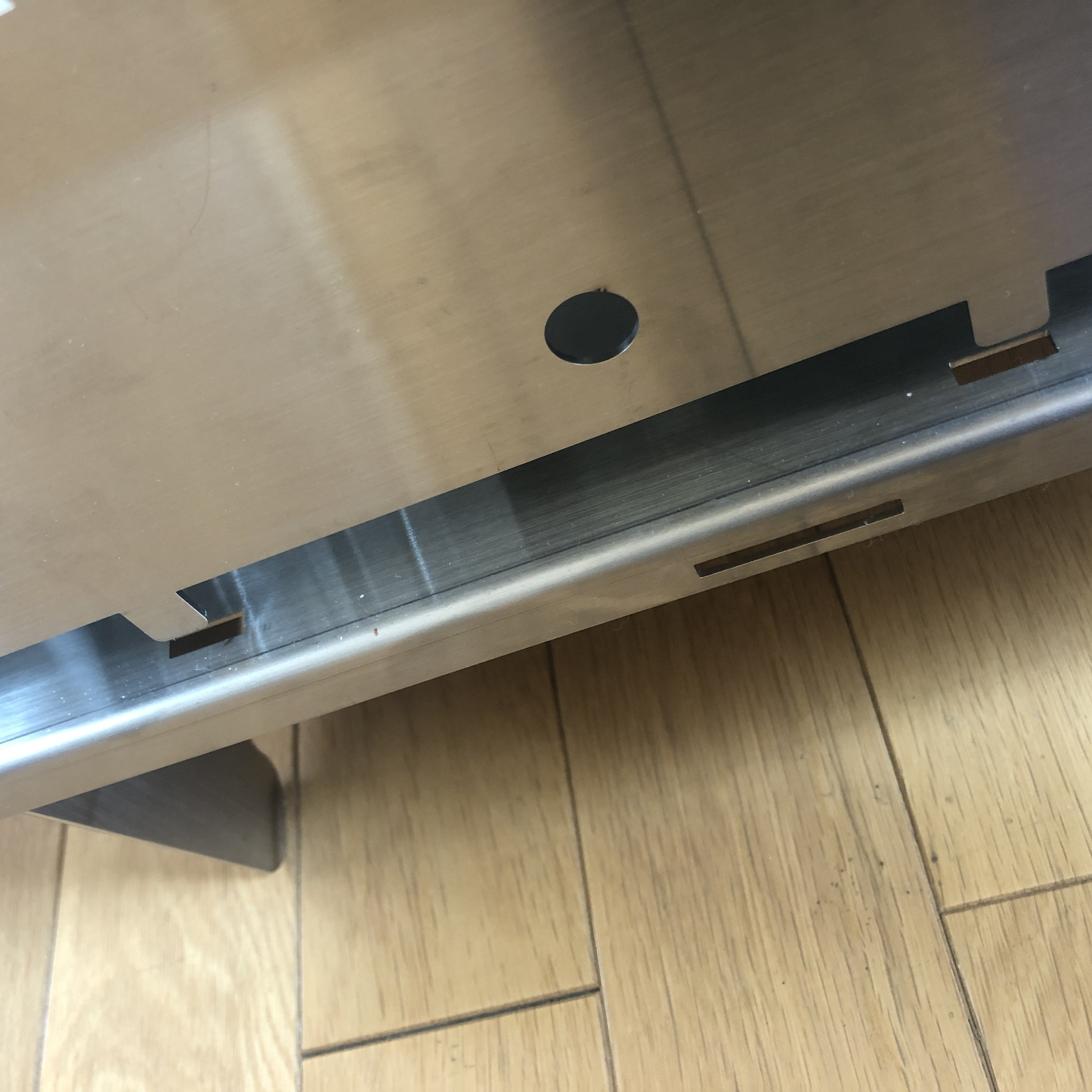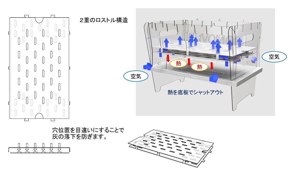 燃焼で生じた灰は目違いの穴構造によりオーブン部分への落下を最小限にし、焚火と調理を同時に快適に行うことができるようになっています。