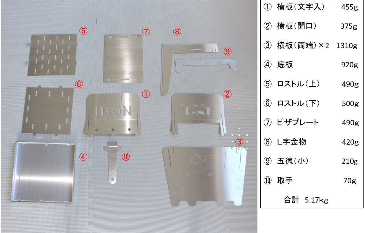 (上)・ロストル(下)・ピザプレート・L字金物×2・五徳(小)×2・