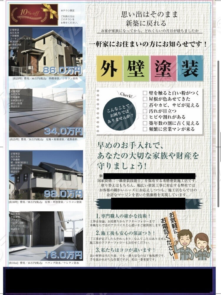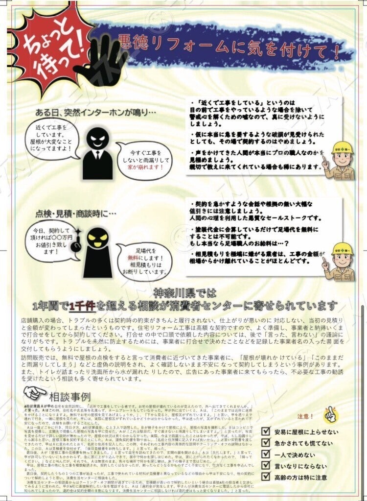 実績として、リフォーム業界で横行している悪徳訪問販売に対する注意喚起を促すために実際にこうした❝うちわ❞(夏季仕様)を活用した広告やポスティングを作っておりました。添付画像に関しては相模ライフ株式会社との業務委託契約のもと制作を進め、実際に広告活動をしました。