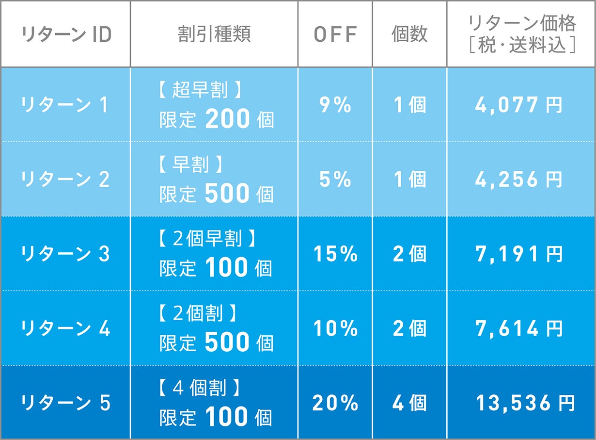 ご支援いただきますお礼に、「casara」完成品をリターンとしてお届けいたします。 超早割・早割とご用意し、ご支援の早い順に割引率を高く設定いたしました。 また、さらにお得な 【 2個割 】 【 4個割 】もございます。 数量限定ですので、是非お早めのご支援をご検討いただければ幸いです。