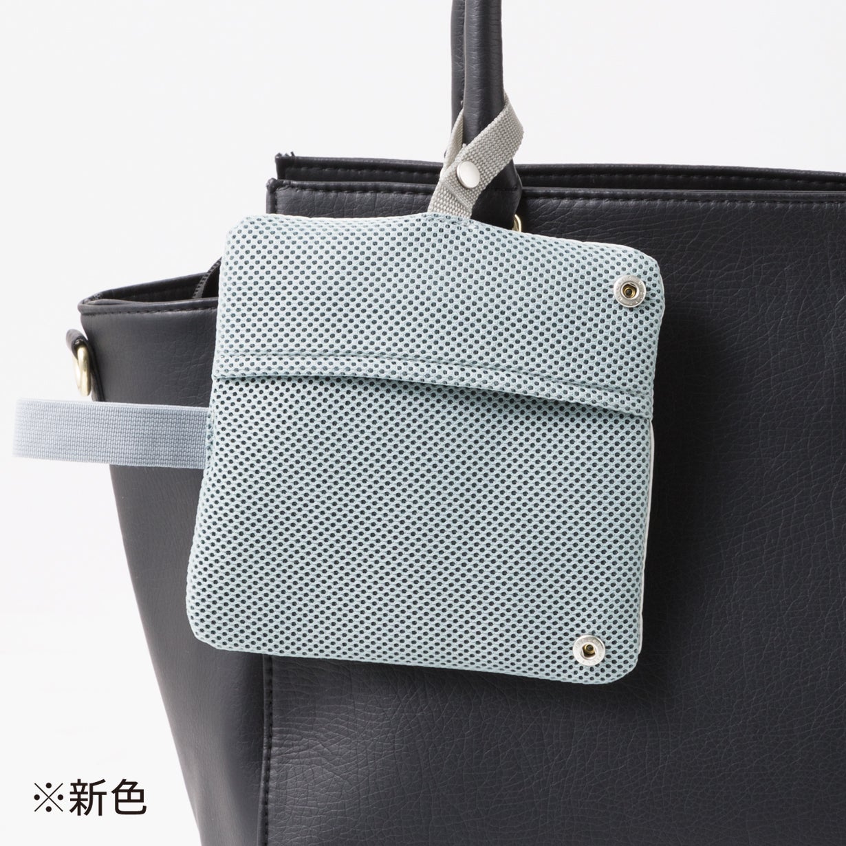 新色のライトグレイ、グリーン、ベージュ、ピンクの4色には、さらにスナップバンドを付けました。より手軽にバッグの持ち手などに取り付けることが出来ます。