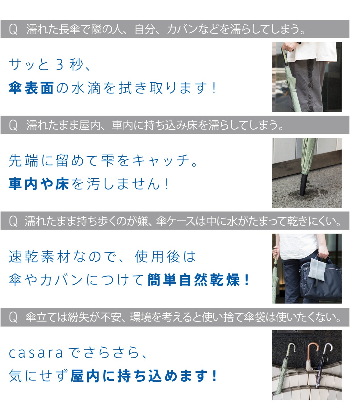 これまでは、濡れたままでカフェやショップに入ると迷惑。傘カバーも結局水が溜まって床が気になる。サッと一拭き&先端に取り付け、気持ちよく利用!