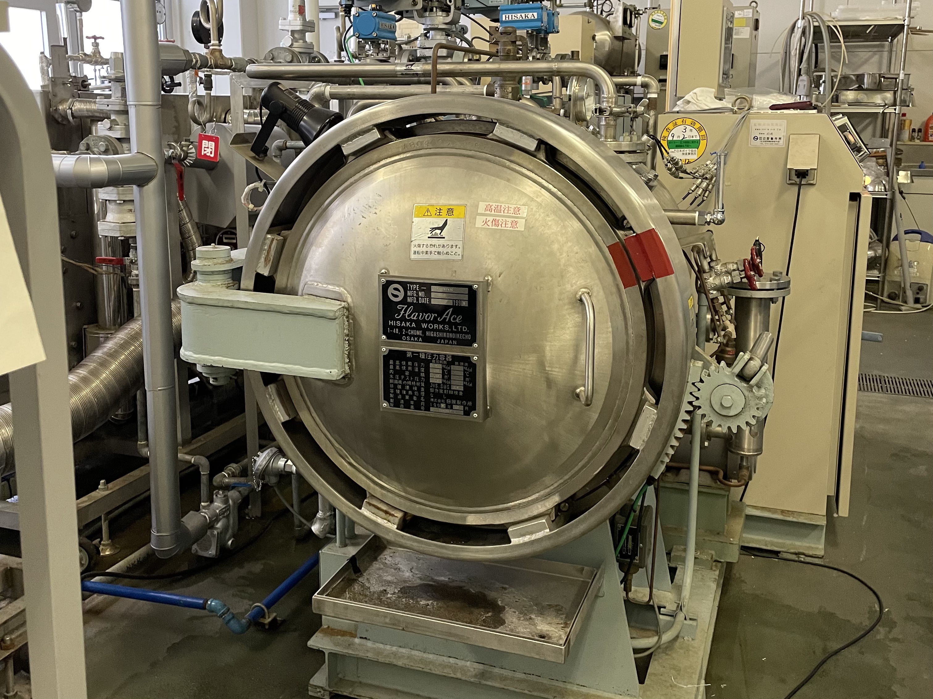 ※写真はレトルト食品を加熱殺菌する機械です、実際に加熱殺菌を試験的に行い味見をしながら香りのバランス、食感などを調整してます。
