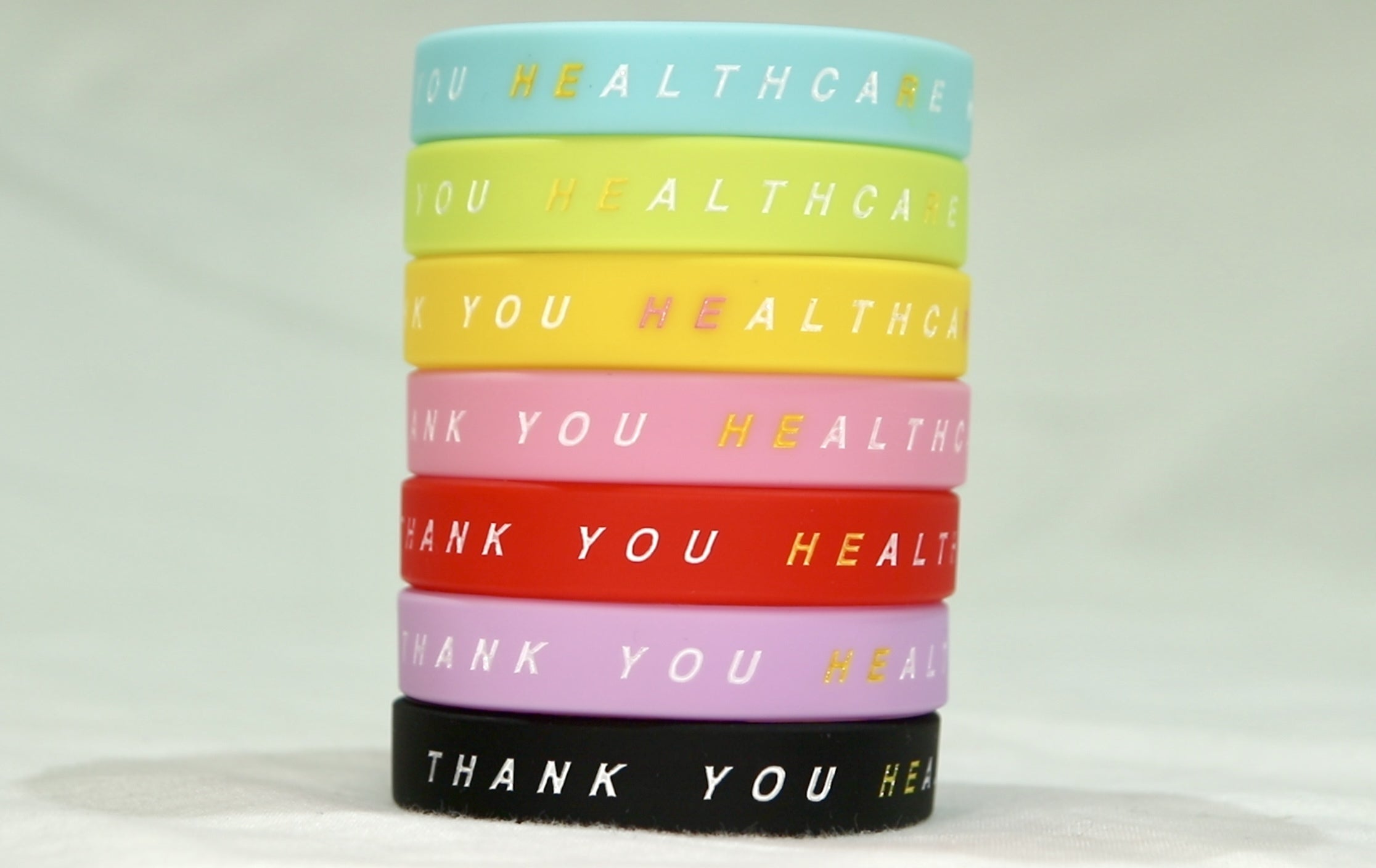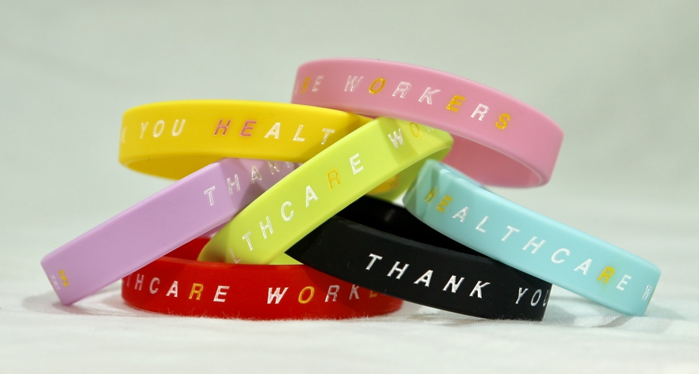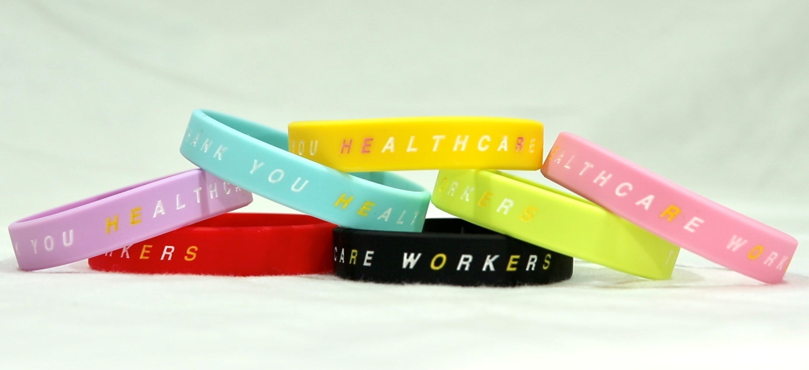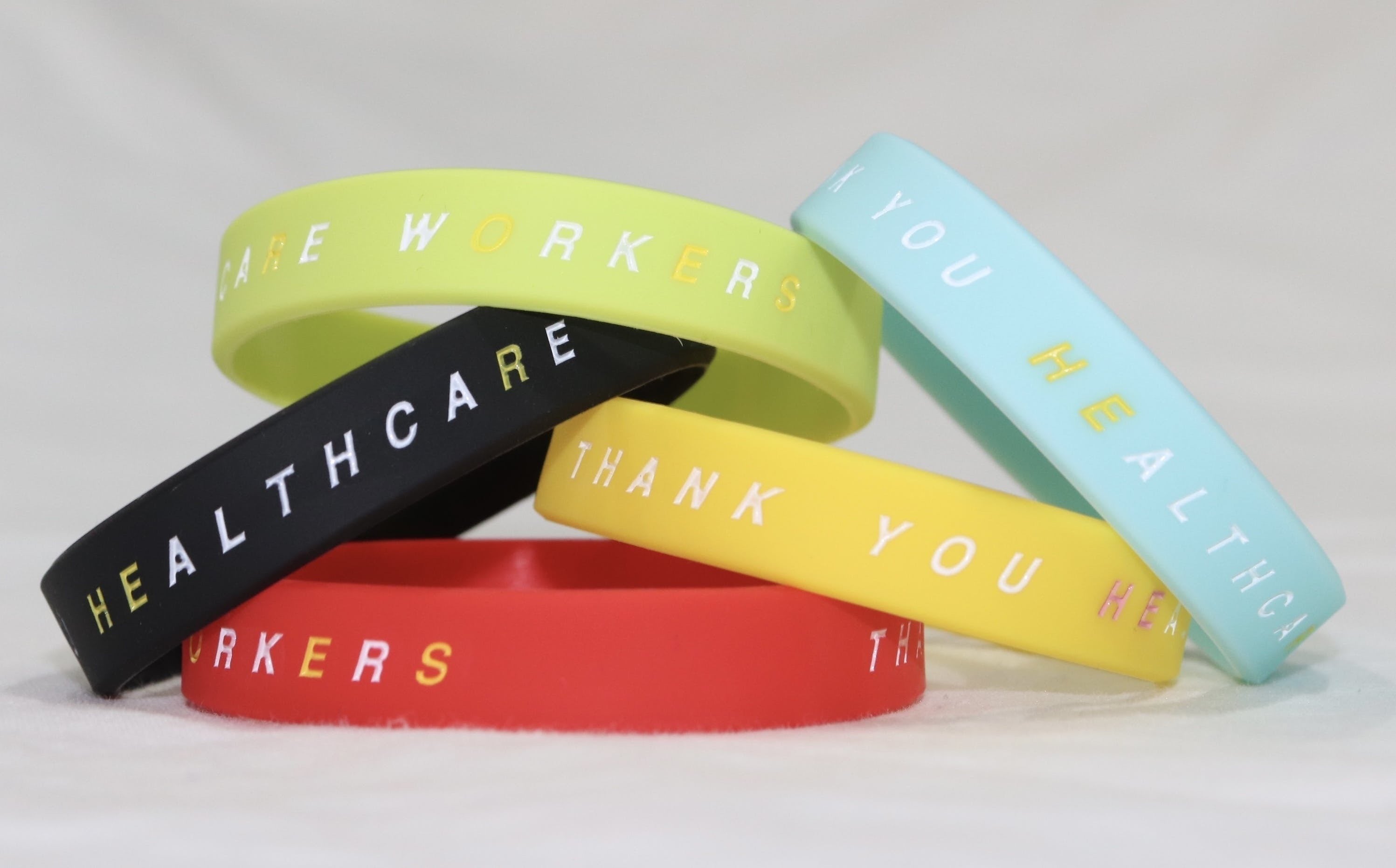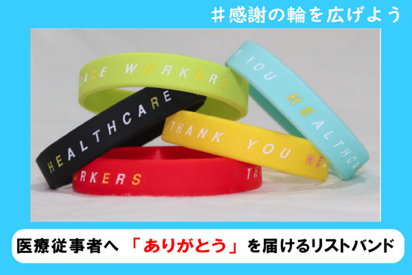 「感謝の輪」とは、医療従事者にありがとうを届けるリストバンドの名称です。リストバンドには、医療従事者への感謝のメッセージが記されています。