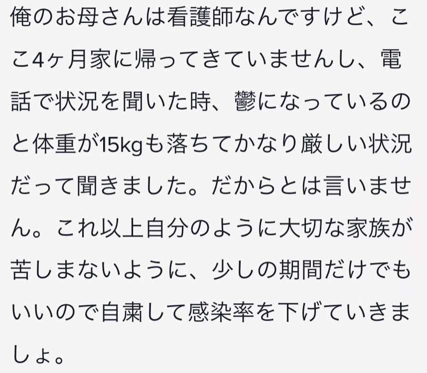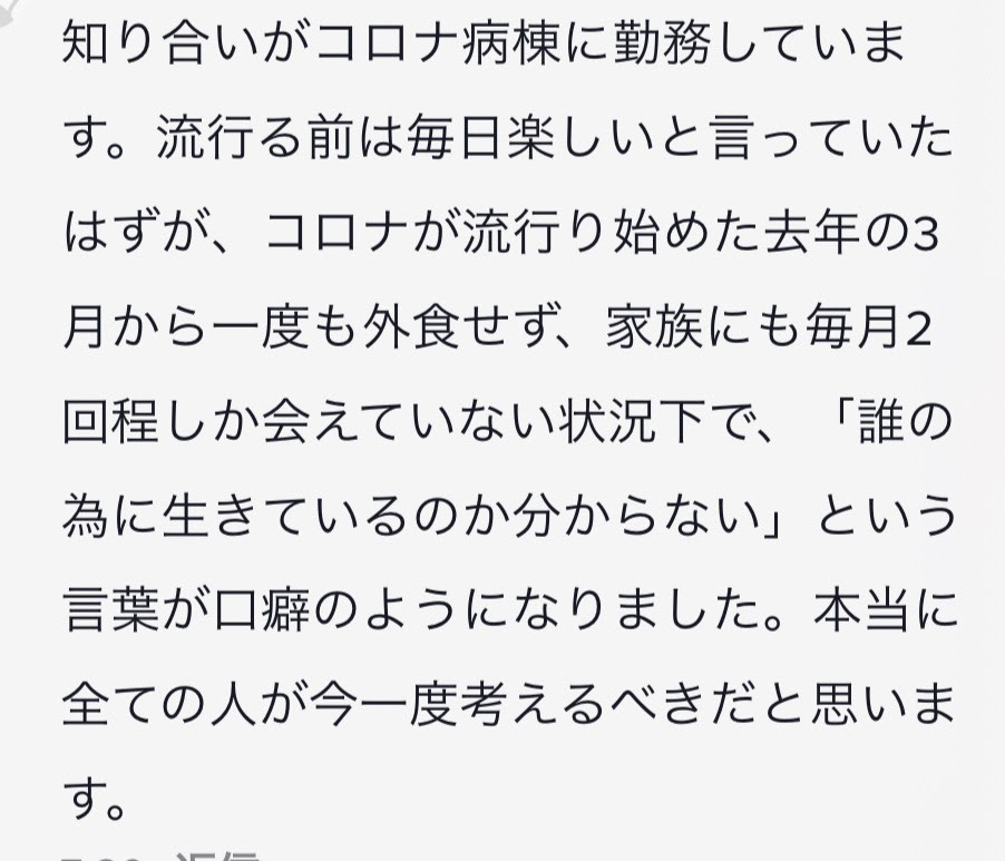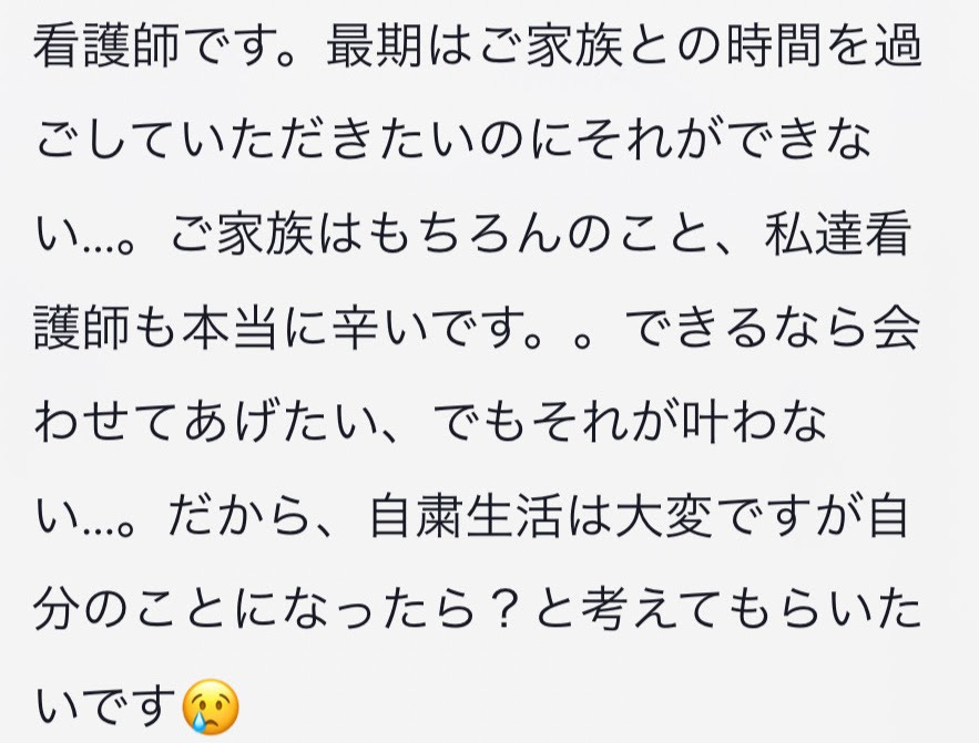 私たちは感染者数を一人でも減らしたいという想いから、 医療従事者の現状をSNSで発信しています。