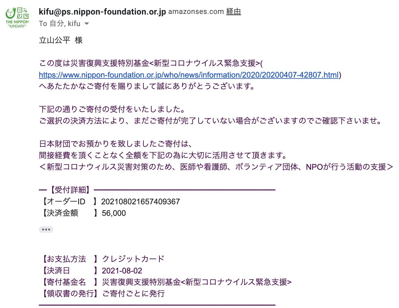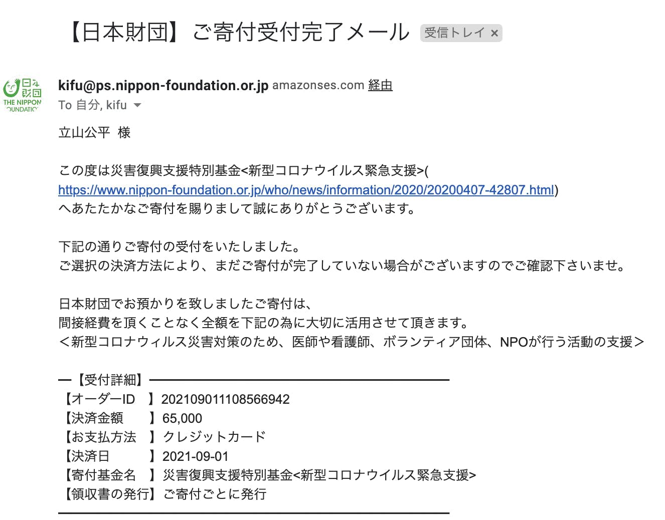 寄付先:日本財団様の「新型コロナウイルス感染症拡大に伴う支援」