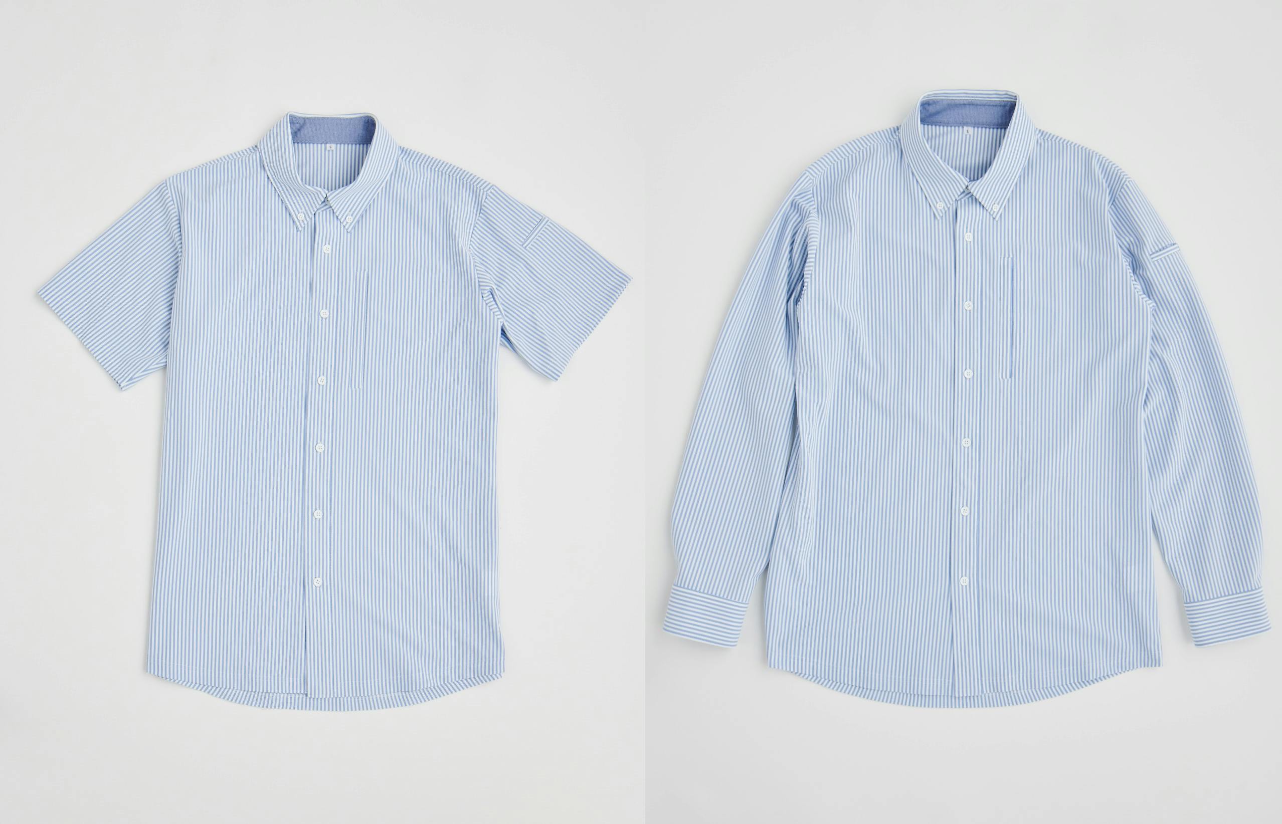 今回は誰でも着やすいストライプ柄の生地で、長袖と半袖の2種類をお届けします。