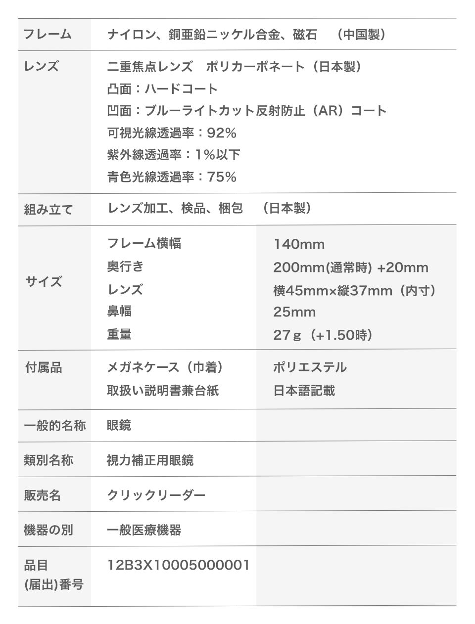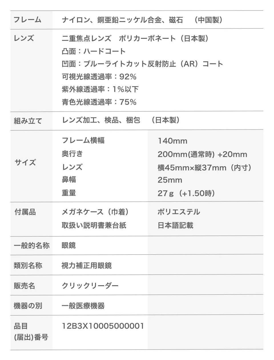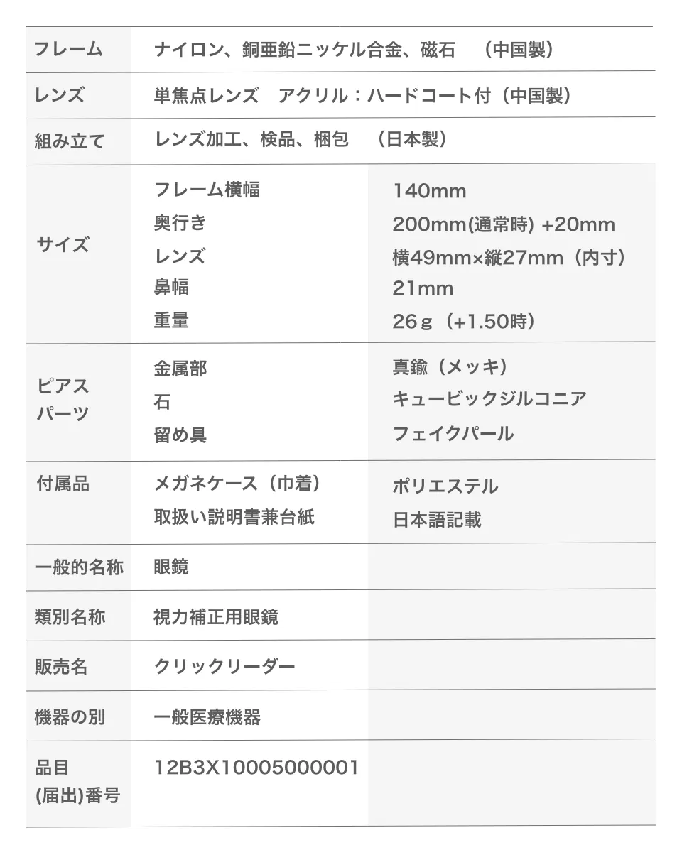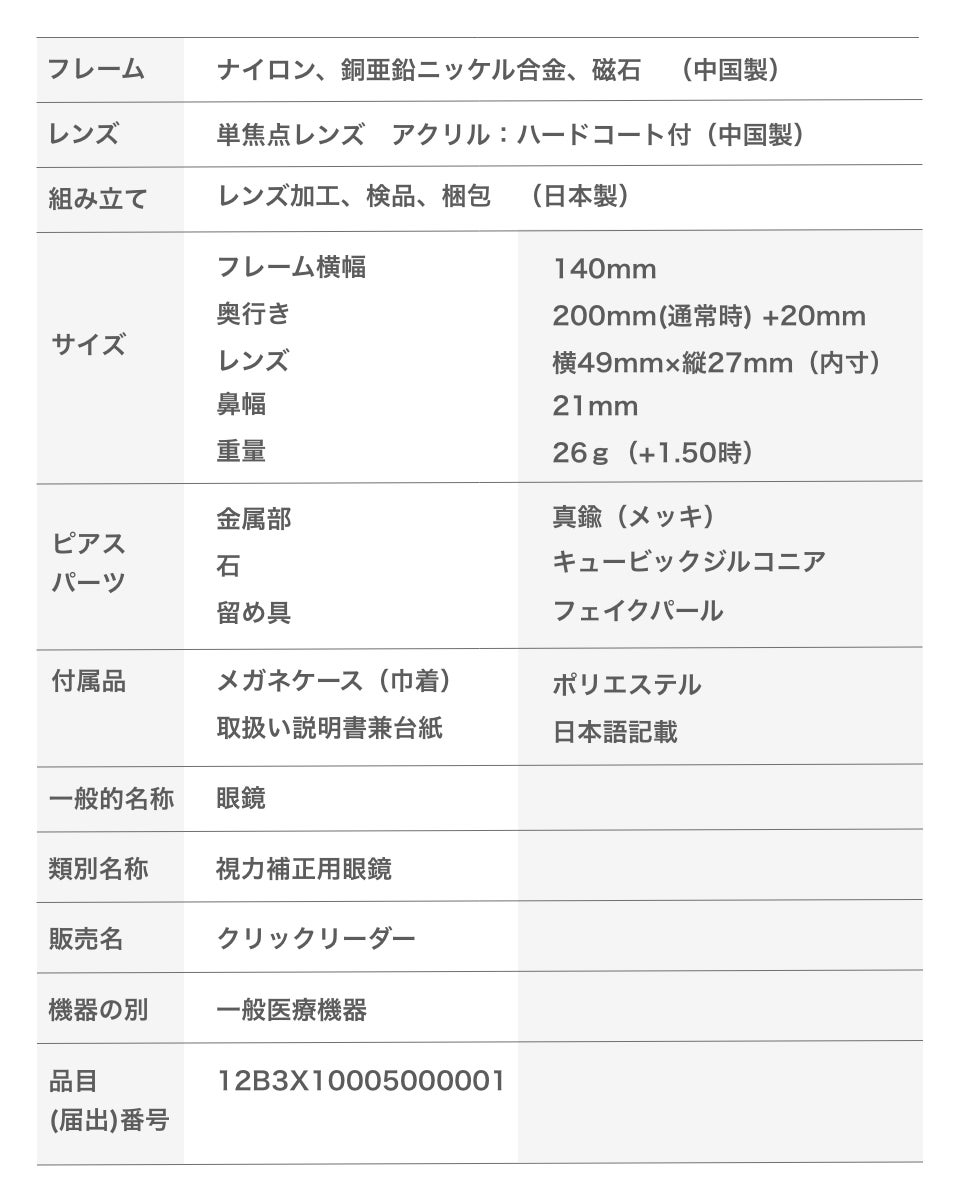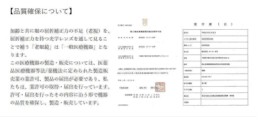 現在、私たちが販売しているクリックリーダーは、既成「老眼鏡」です。手元や近くの物にピントが合う単焦点の凸レンズを使用しています。ご使用される方の眼の度数や距離に合わせ、快適に近くの物が見えるレンズの度数を選んで頂きます。