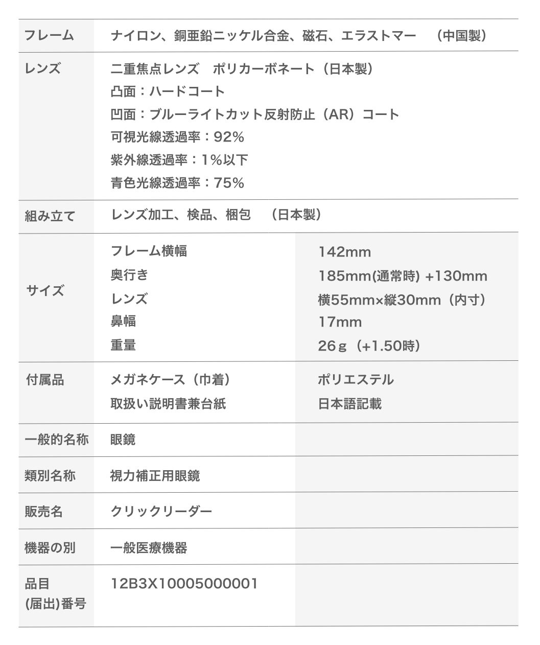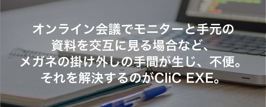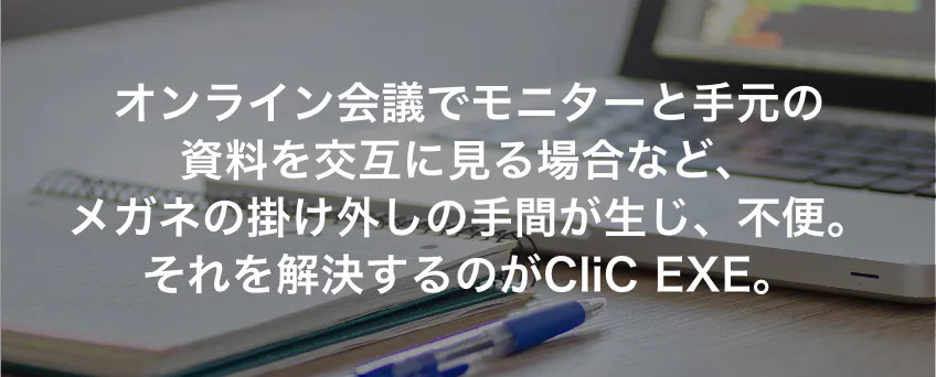 「CliC EXE」(クリック エグゼ)は、「老眼鏡」のように、手元のみにピントが合う単焦点レンズではなく、遠くと近くを見ることが可能な、境目のある遠近両用レンズ、いわゆる「二重焦点」(バイフォーカル)レンズを使用した商品です。