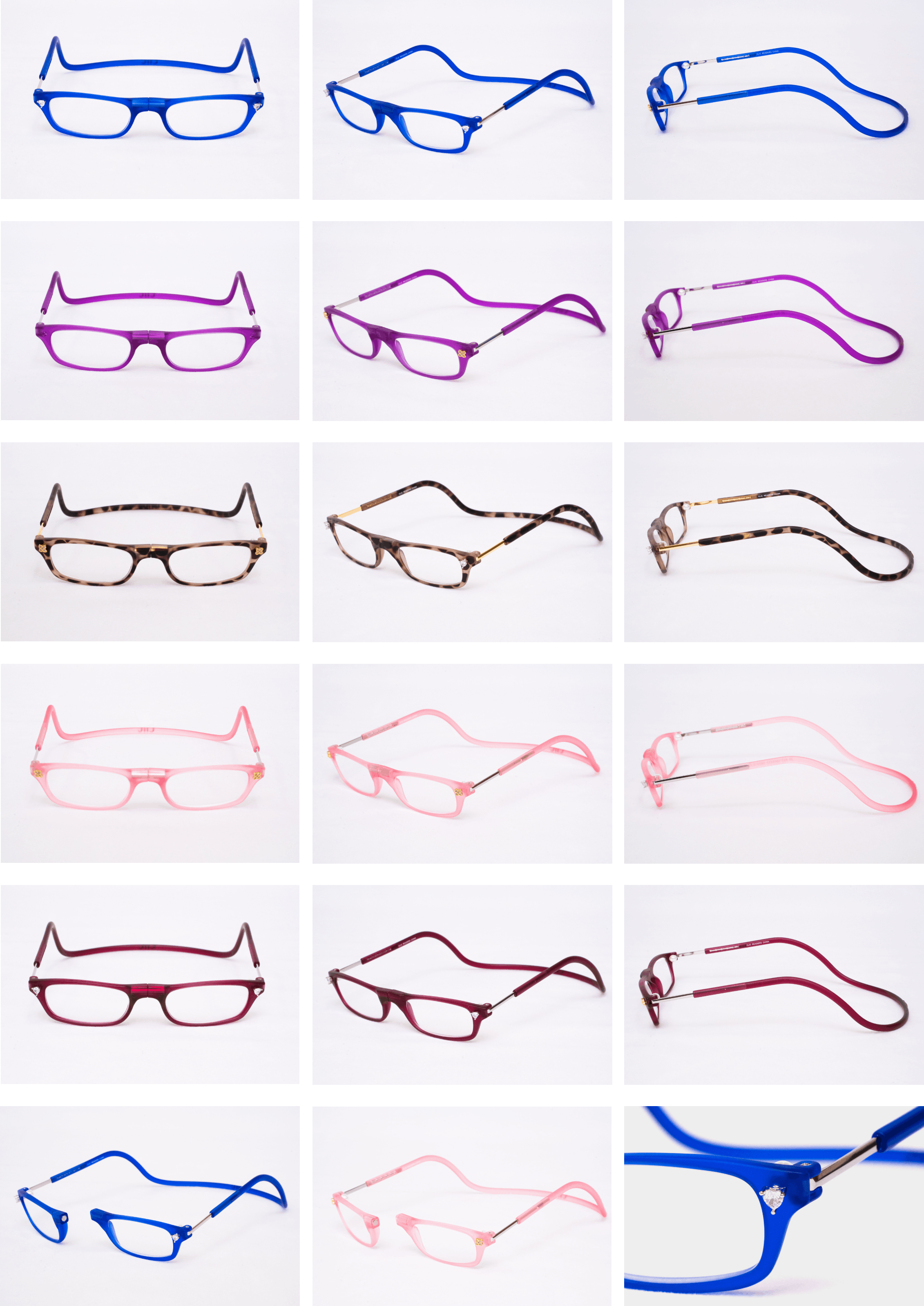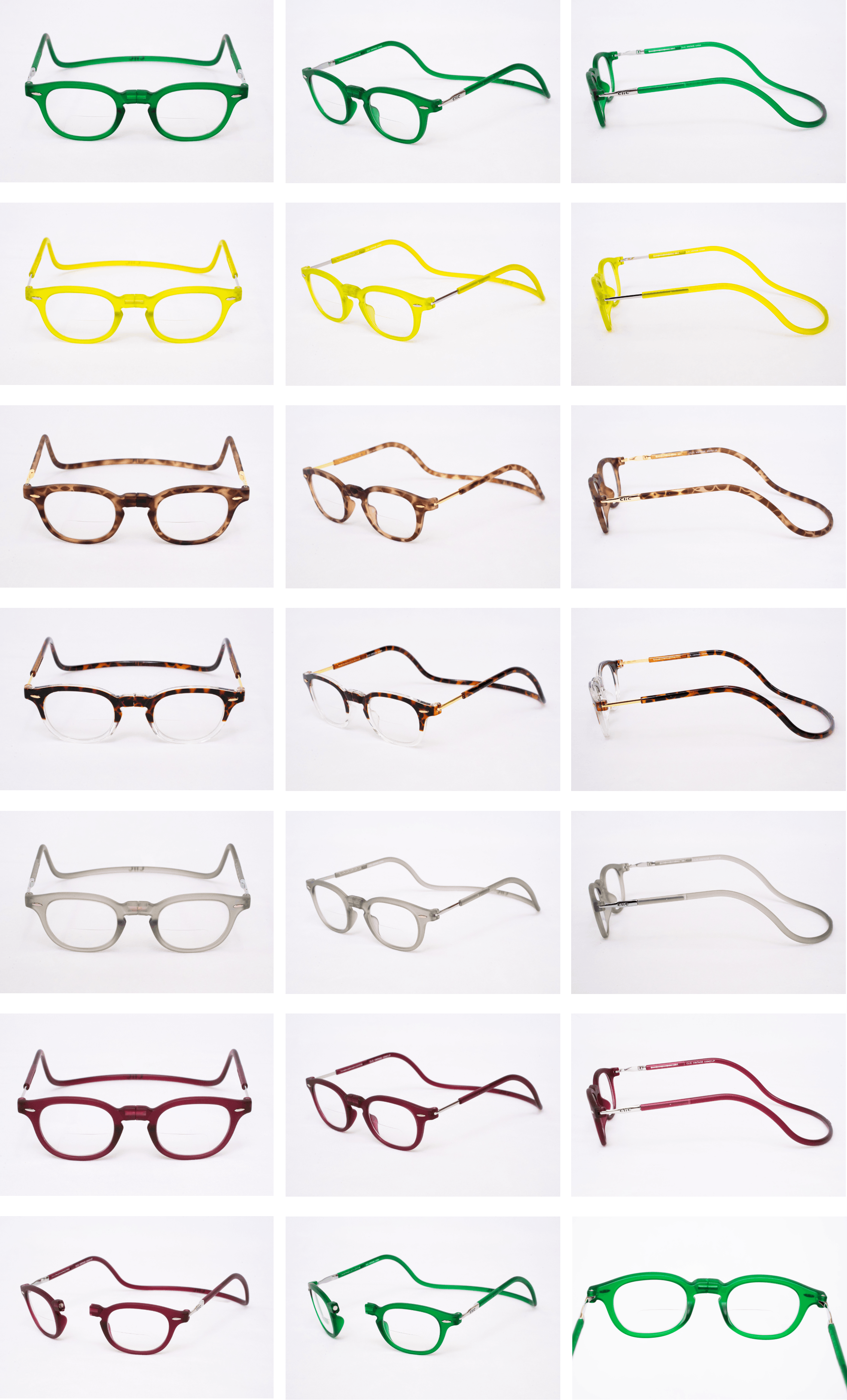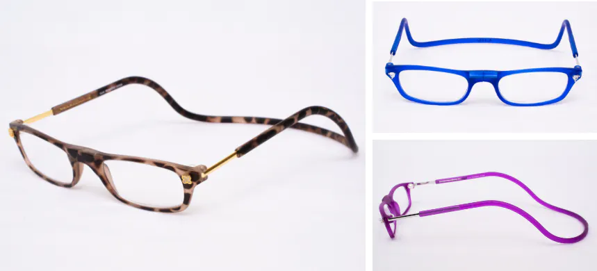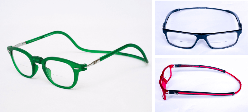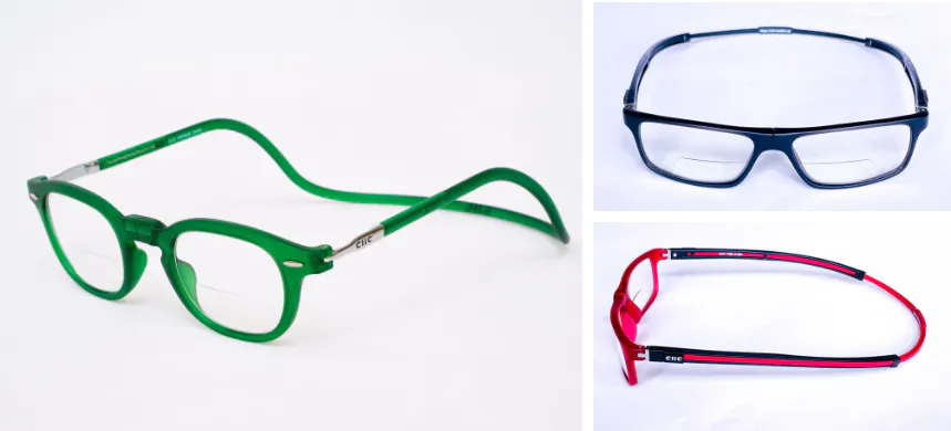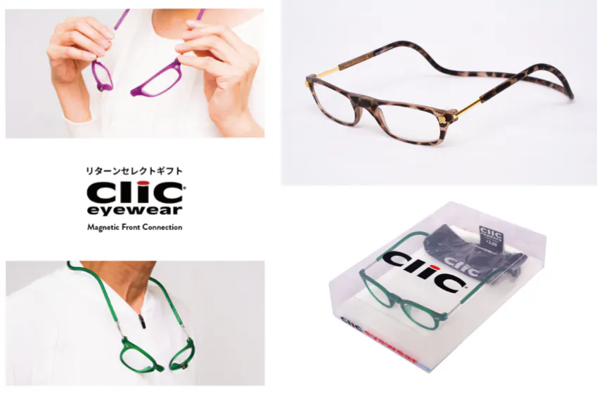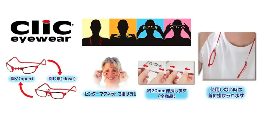 私たちが日本総販売元として販売を行っている、USA発ブランド【CliC(クリック)】は、フレームに埋め込まれた磁石でメガネの掛け外しを行い、使わないときには首にかけておけるという、従来のメガネの概念を覆す、画期的な構造を持ったメガネフレームです。