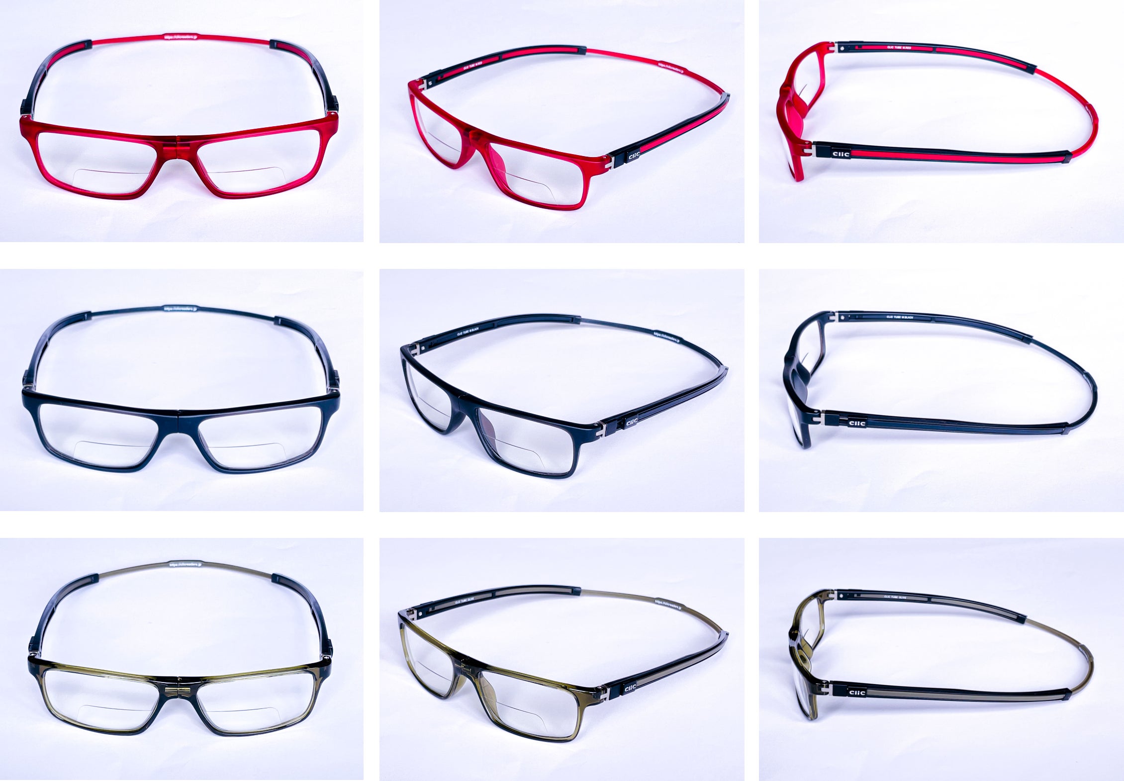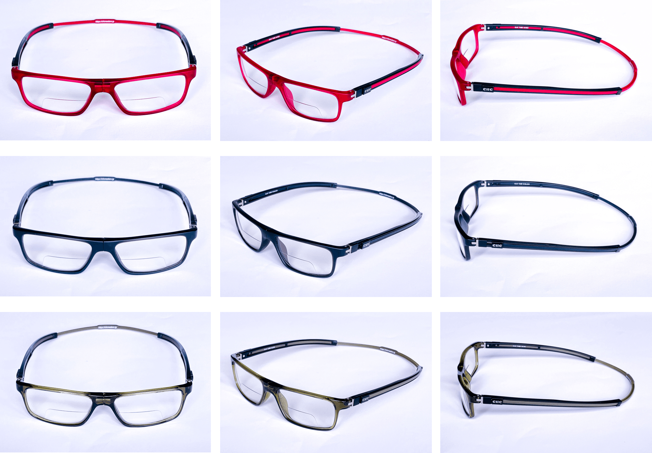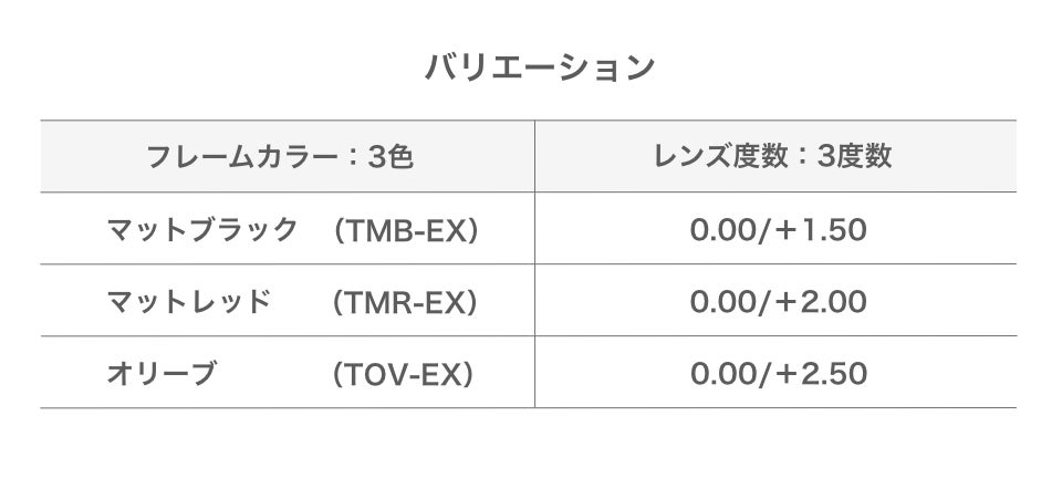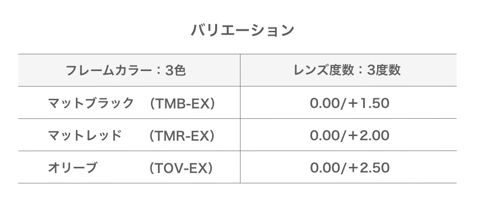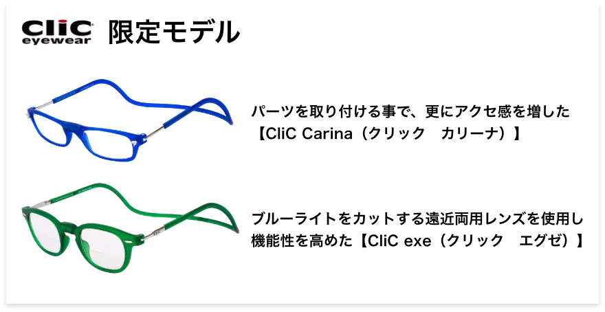 クリック初となる二重焦点レンズを使用した「CliC EXE」(クリック エグゼ)は、スッキリとしたスクエア形状フレームを使用した、「Tube EXE」(チューブ エグゼ)と、レトロ感を漂わせる丸みを帯びたボストン形状フレームの「Vintage EXE」(ヴィンテージ エグゼ)の2つのモデルに、「老眼部」のレンズ度数は、年齢や、その方の眼の度数に合わせた+1.50/+2.00/+2.50の3度数をご用意致しました。