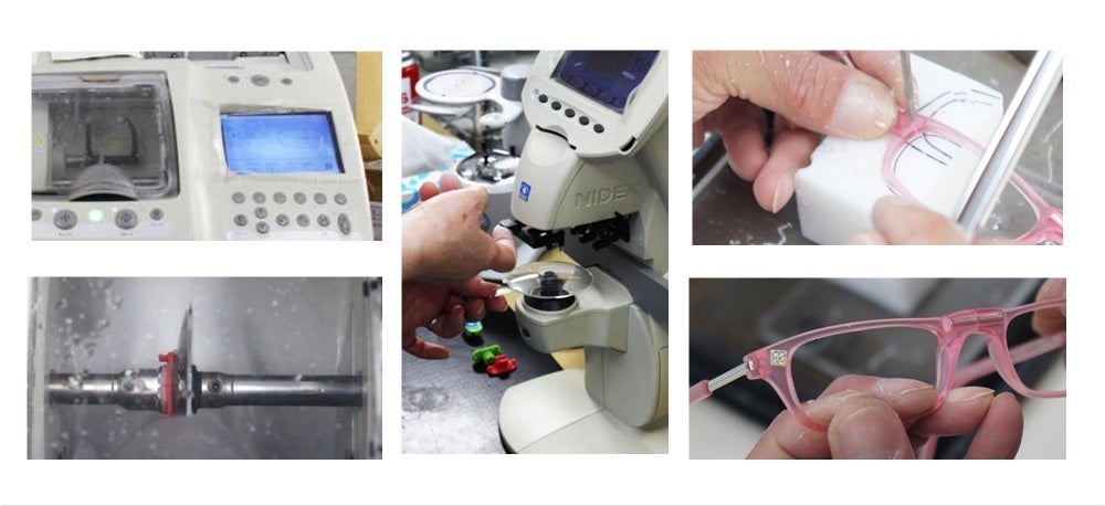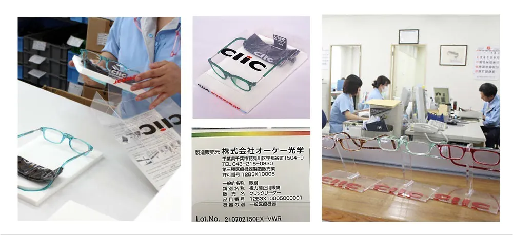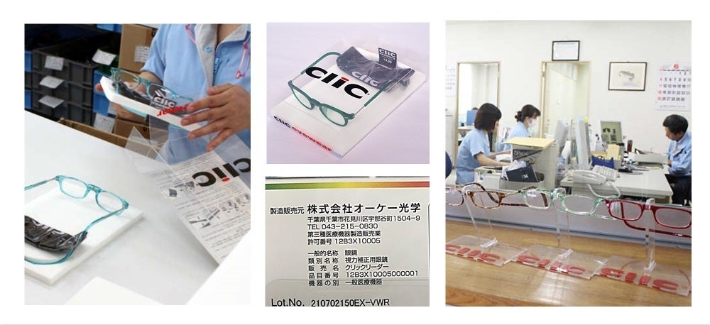 このフレームに日本でレンズを入れて加工し、【CliC readers(クリックリーダー)】という「老眼鏡」が作られています。