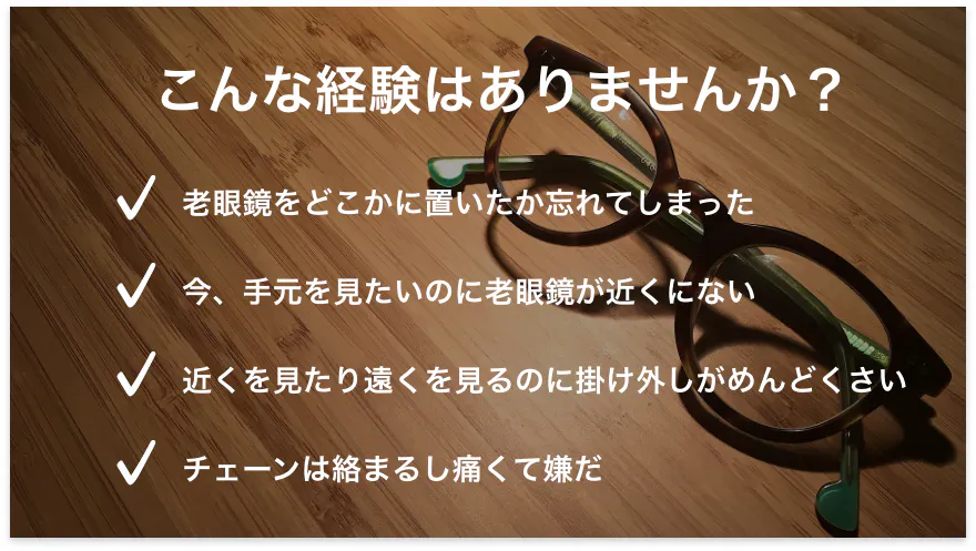 クリックリーダーに限らず、一般的なお話となりますが、手元の細かい文字にピントがあう「老眼鏡」は、例えば、電車に乗った際、スマホで乗り換えルートなどを確認し、車内の路線図を見るような場合、メガネを一旦外し、頭の上にのせる・首に掛けておくなど、掛け外しの手間が必要となります。