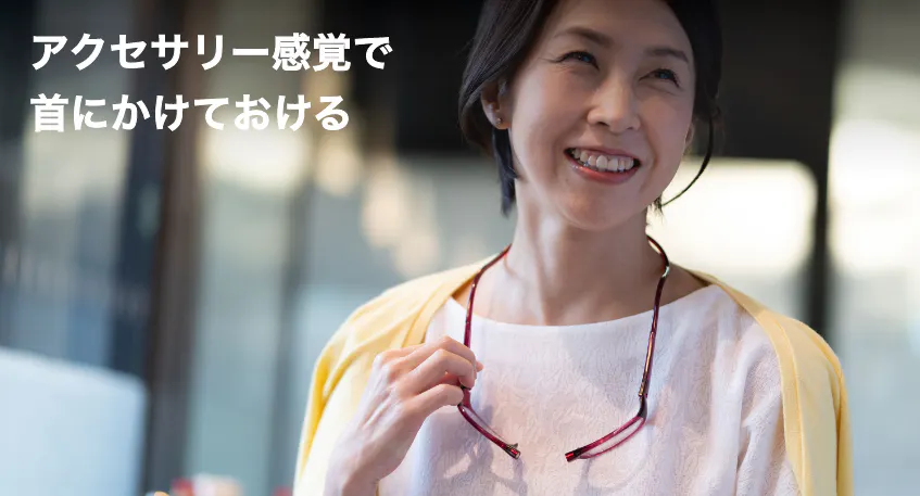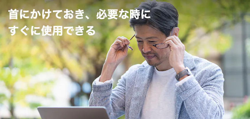 「首にかけておき、必要な時にすぐに使用できる」という利便性、「アクセサリー感覚で、首にかけておける」というデザイン性から、スタイリッシュなシニアグラス(老眼鏡)として、ご評価を頂いています。