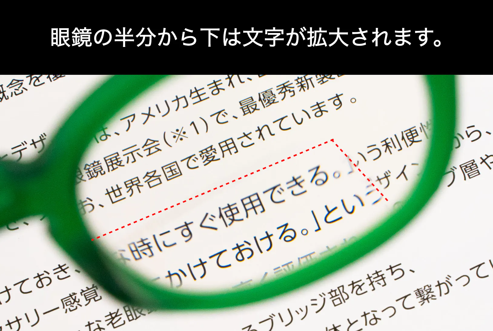 そのため、メガネを掛け外しすることなく、視線を少し下側にずらす事で、手元の細かい文字などを快適に見ることが可能です。