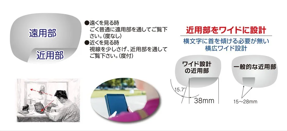 また、近くを見る「老眼用」の部分は、一般的な眼鏡レンズのサイズ幅:25~28㎜に対し、幅広ワイドな35㎜幅となっているのも特長です。幅広ワイドの為、顔を横に動かさなくても視線を切替すれば、