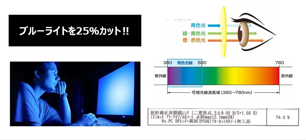さらに、レンズの凹面には、反射や光のギラツキを抑える反射防止処理(ARコート)に加え、ブルーライトを約25%カットするコーティングを施していますので、液晶画面のチラツキなども軽減します。