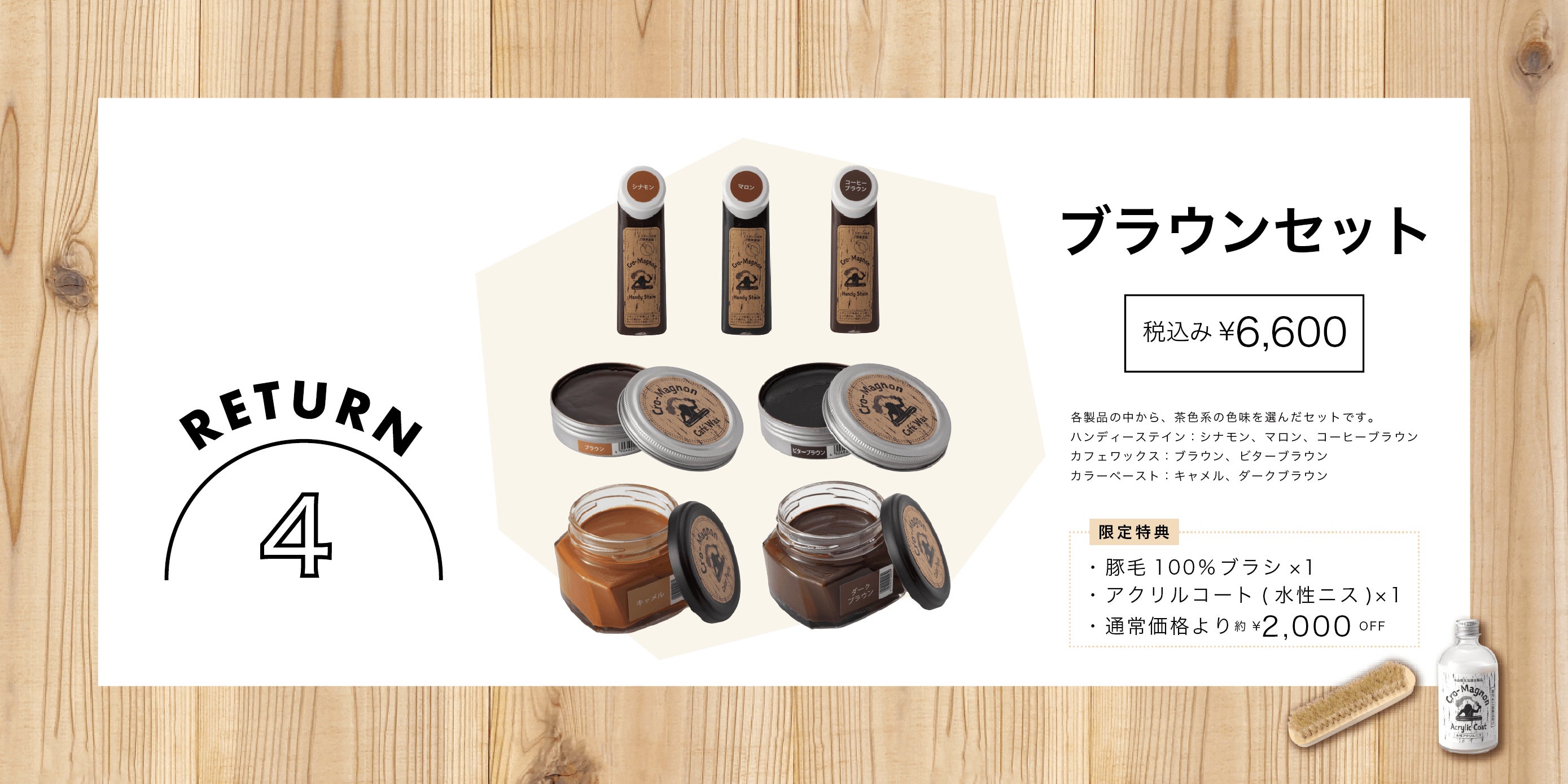 ⇒ハンディステイン:880円(税込)、カフェワックス:880円(税込)、カラーペースト:990円(税込)となります。リターンの「よりどり3つセット」及び「よりどり5つセット」は、お選びする製品によって参考通常価格が異なるため、「〇〇円以上」と表現させていただいております。また、限定特典のOFF金額についても最小金額と最大金額の平均からの割引金額を表記しております。