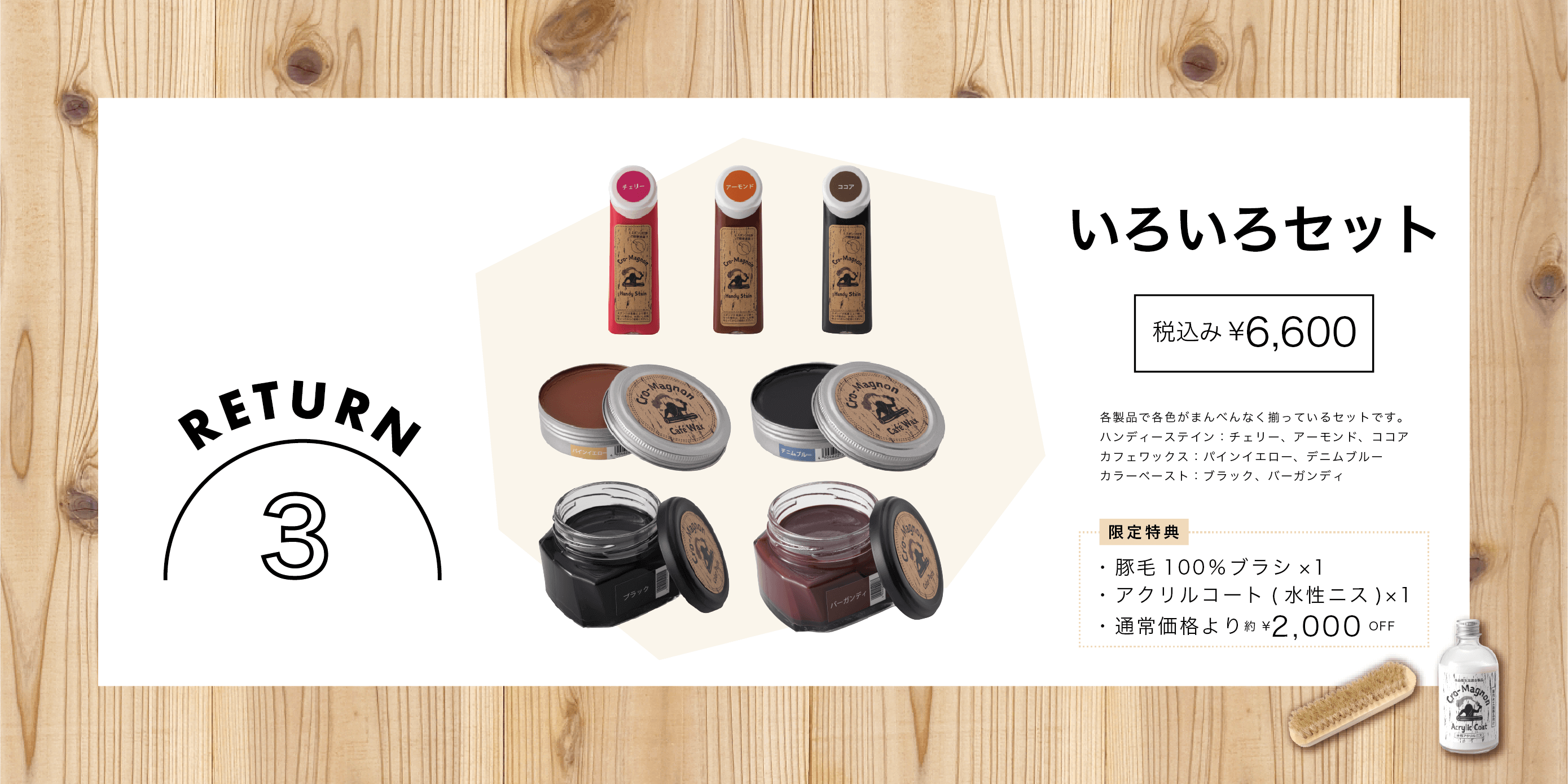⇒ハンディステイン:880円(税込)、カフェワックス:880円(税込)、カラーペースト:990円(税込)となります。リターンの「よりどり3つセット」及び「よりどり5つセット」は、お選びする製品によって参考通常価格が異なるため、「〇〇円以上」と表現させていただいております。また、限定特典のOFF金額についても最小金額と最大金額の平均からの割引金額を表記しております。
