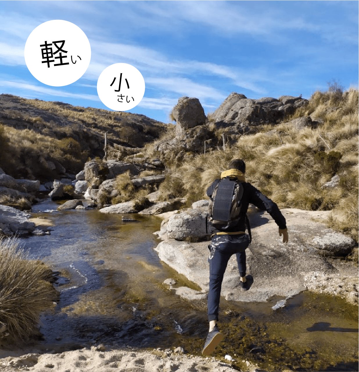 あなたの背中のバックで、ボクが太陽のエネルギーを充電。電源もいらないから、あなたにも環境にも優しいんです。