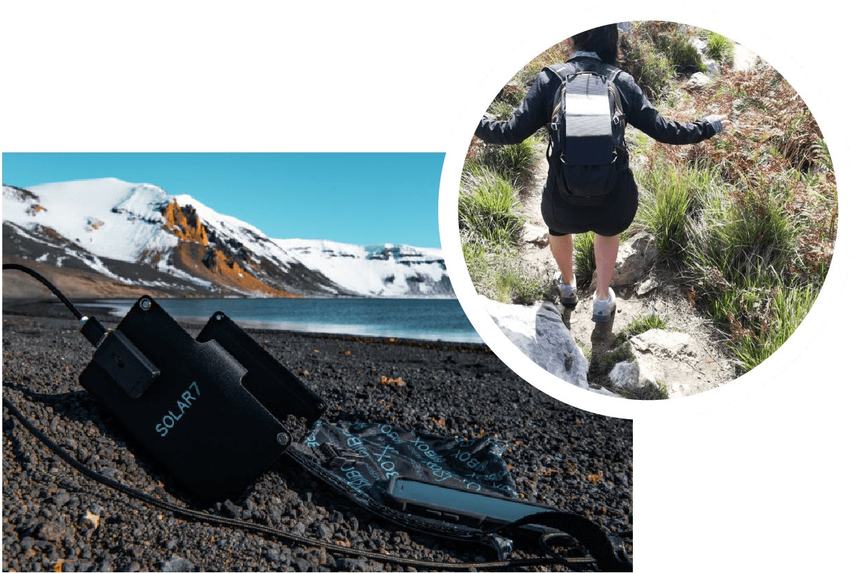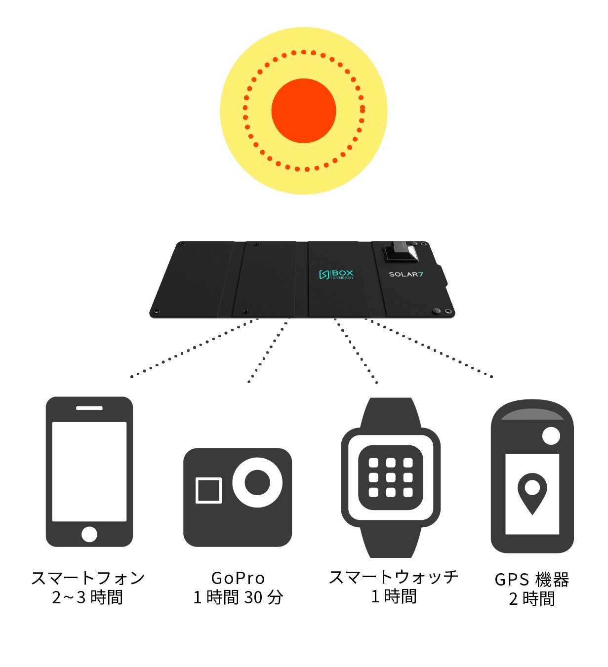 A: SOLAR 7は太陽から生成されたエネルギーで充電します。ソーラーパネルを太陽に向けて開き、お使いのデバイスにUSBワイヤーを差し込むだけです。