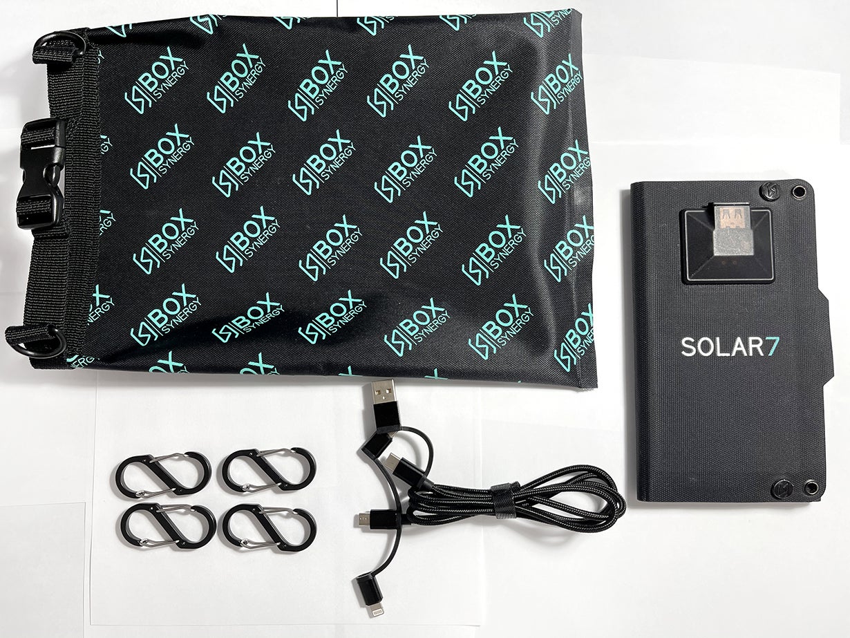 Solar7本体、カラビナ×4、防水ケース×1、5 in 2 USBケーブル