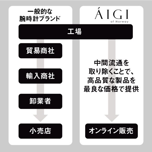 ノルウェー発の北欧時計ブランドアイギ(AIGI)は高級時計の品質の高さをキープしたまま、お客様がお求めしやすい価格帯で時計を提供するという理念を大切にしています。